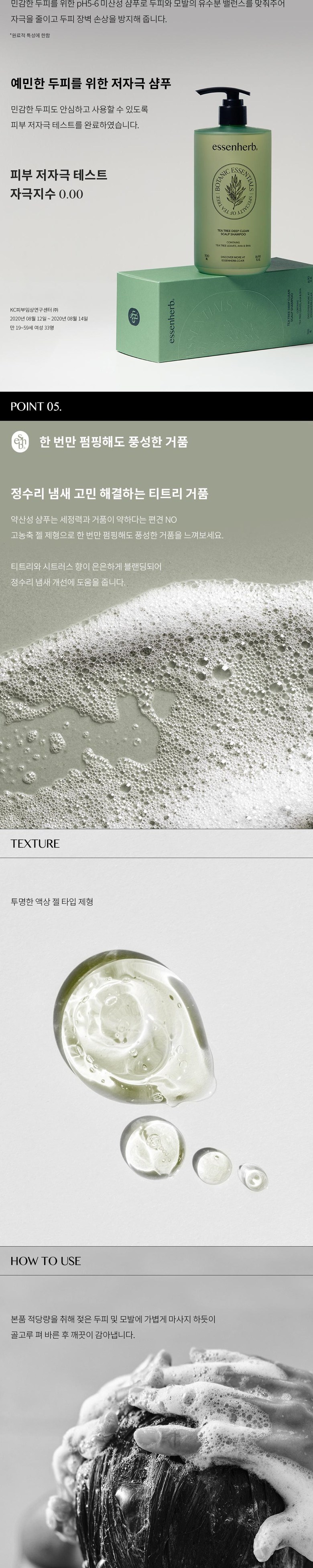 - Dispense an appropriate amount of ESSENHERB Tea Tree Deep Clean Scalp Shampoo into your palm.