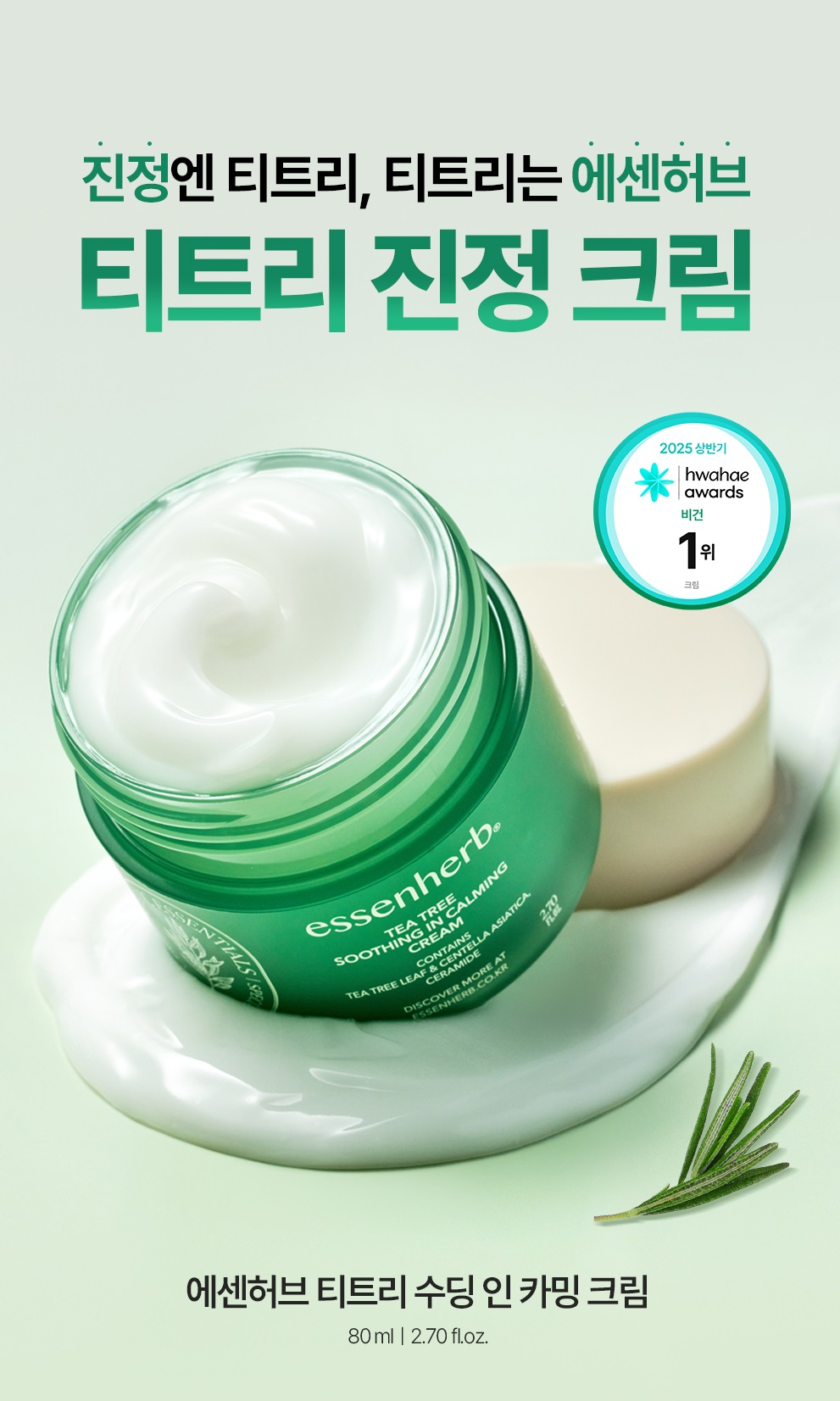 The ESSENHERB Tea Tree Soothing In Calming Cream combines tea tree leaf extract with ceramide for gentle, soothing moisture care. The rich white cream in an elegant green jar provides lasting hydration while calming sensitive, irritated skin.
