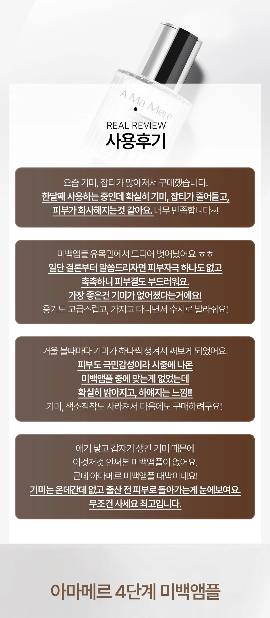 以前から私の顔に悩みがあったんです。そばかすや肌の色ムラ、それに年齢による斑点など、もう何度も様々な製品を試してきました。でもこのA Ma Mere 4-Step Whitening Solution Ampouleは本当に特別です!これまで味わったことのないほど滑らかなテクスチャーで、お肌への浸透感も抜群でした。一ヶ月使ってみて、周囲から「最近おしゃれね」と言われることが多く、自分自身にも自信を持たせてもらっています。まさしく現代人には必需品だと思いました。