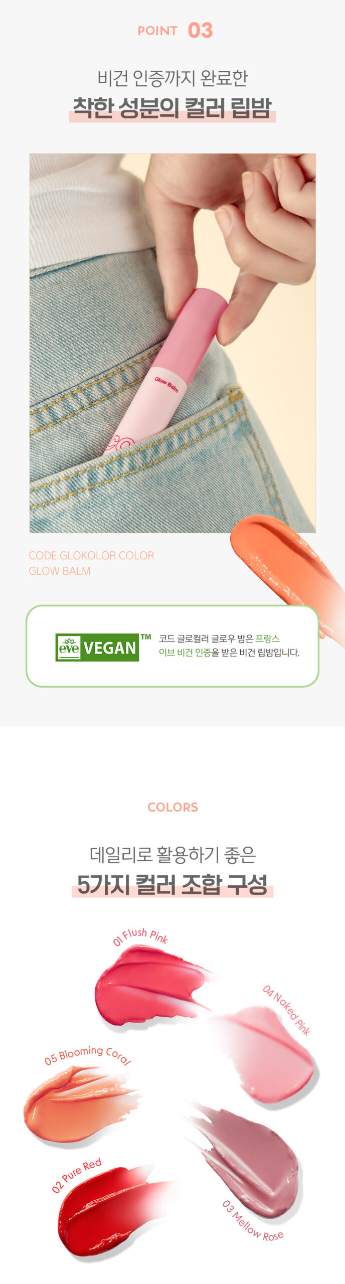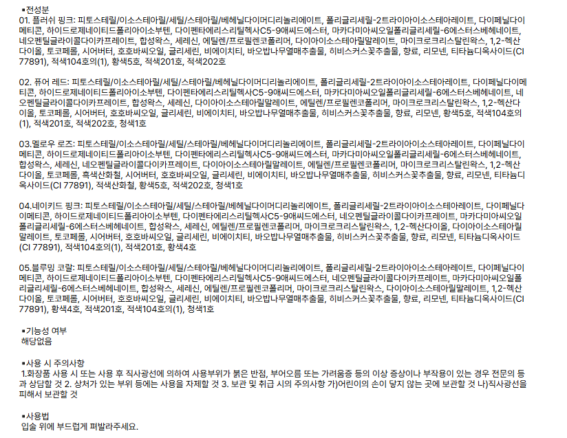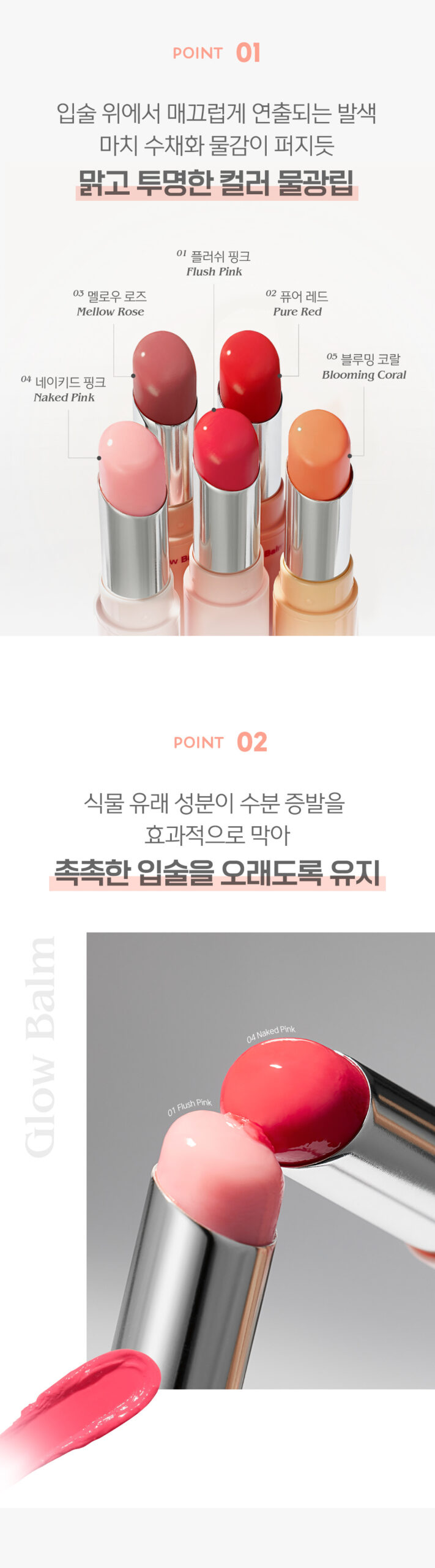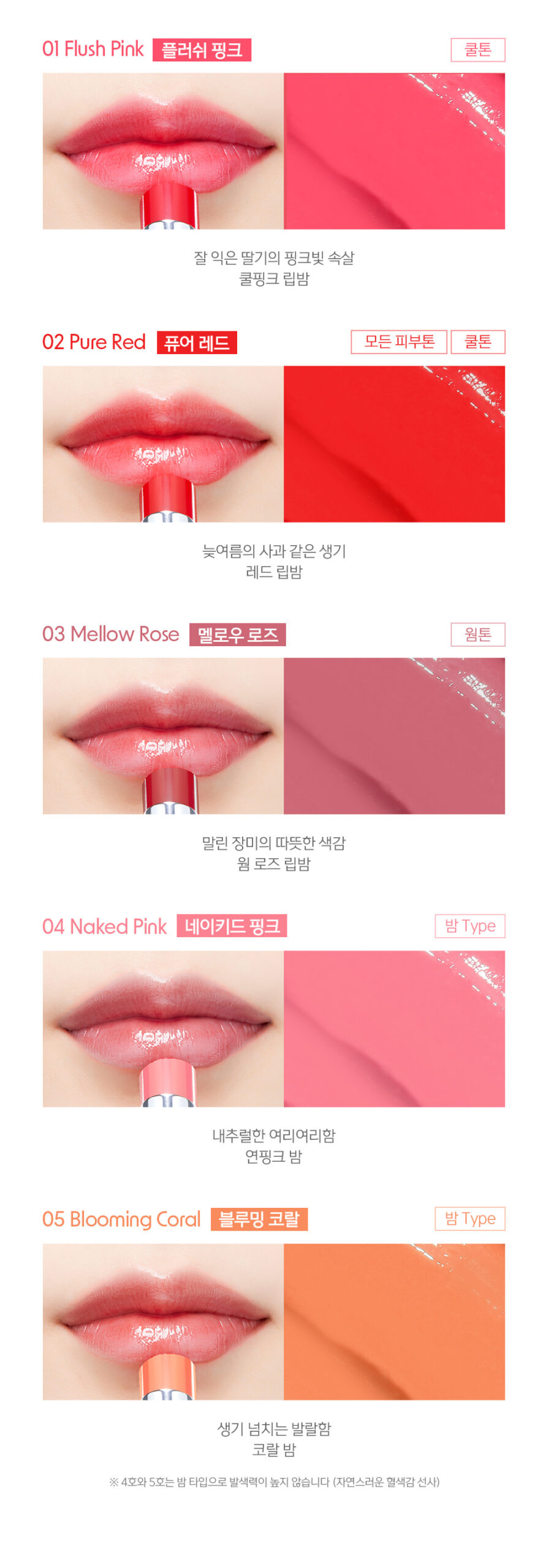 #04. NAKED PINK and 05. BLOOMING CORAL are balm types and do not have high coloring power. (Provides a natural blood-like complexion)