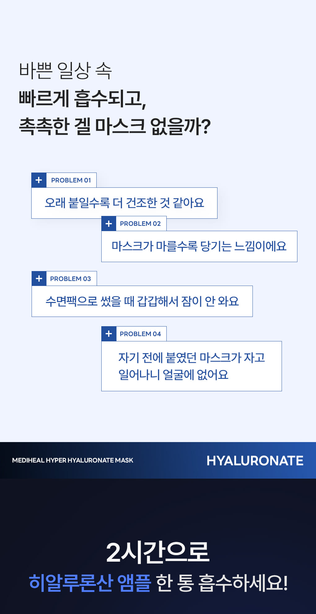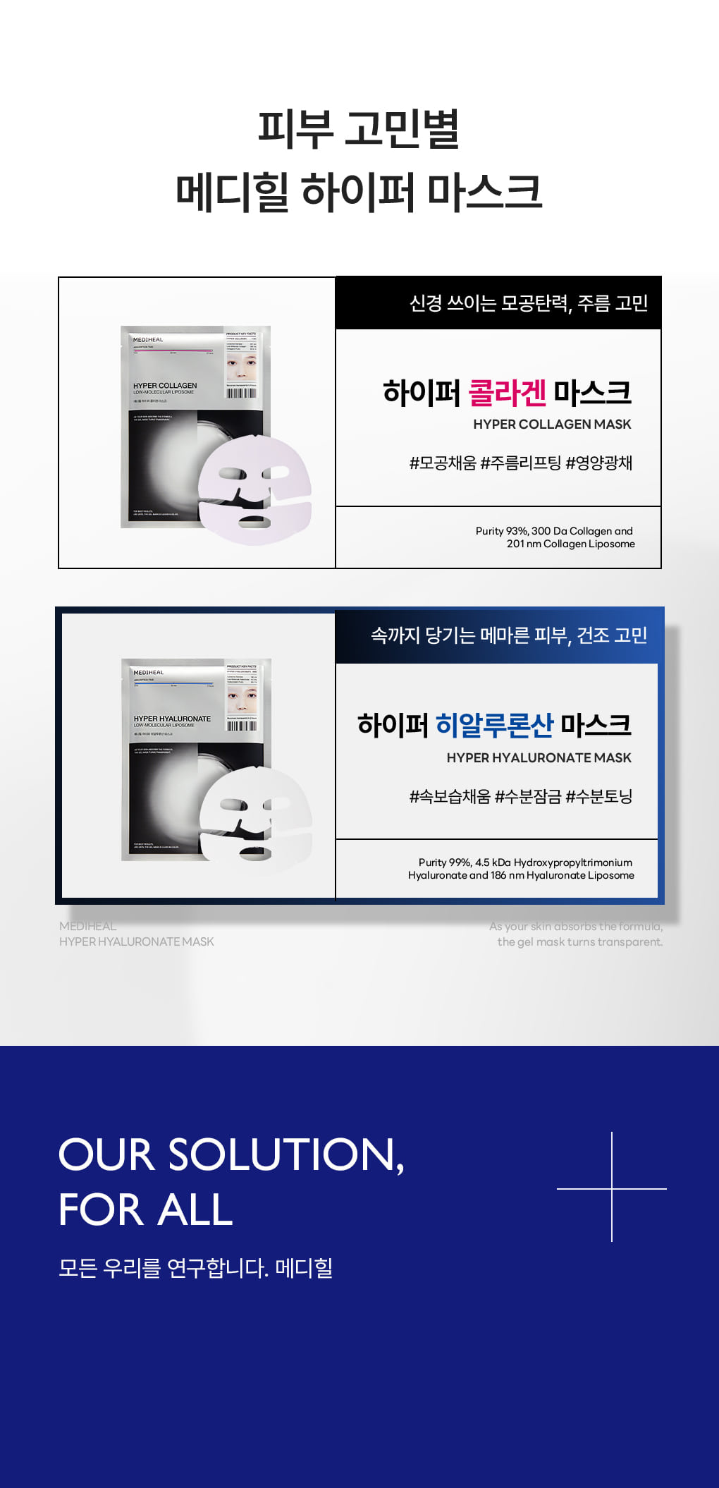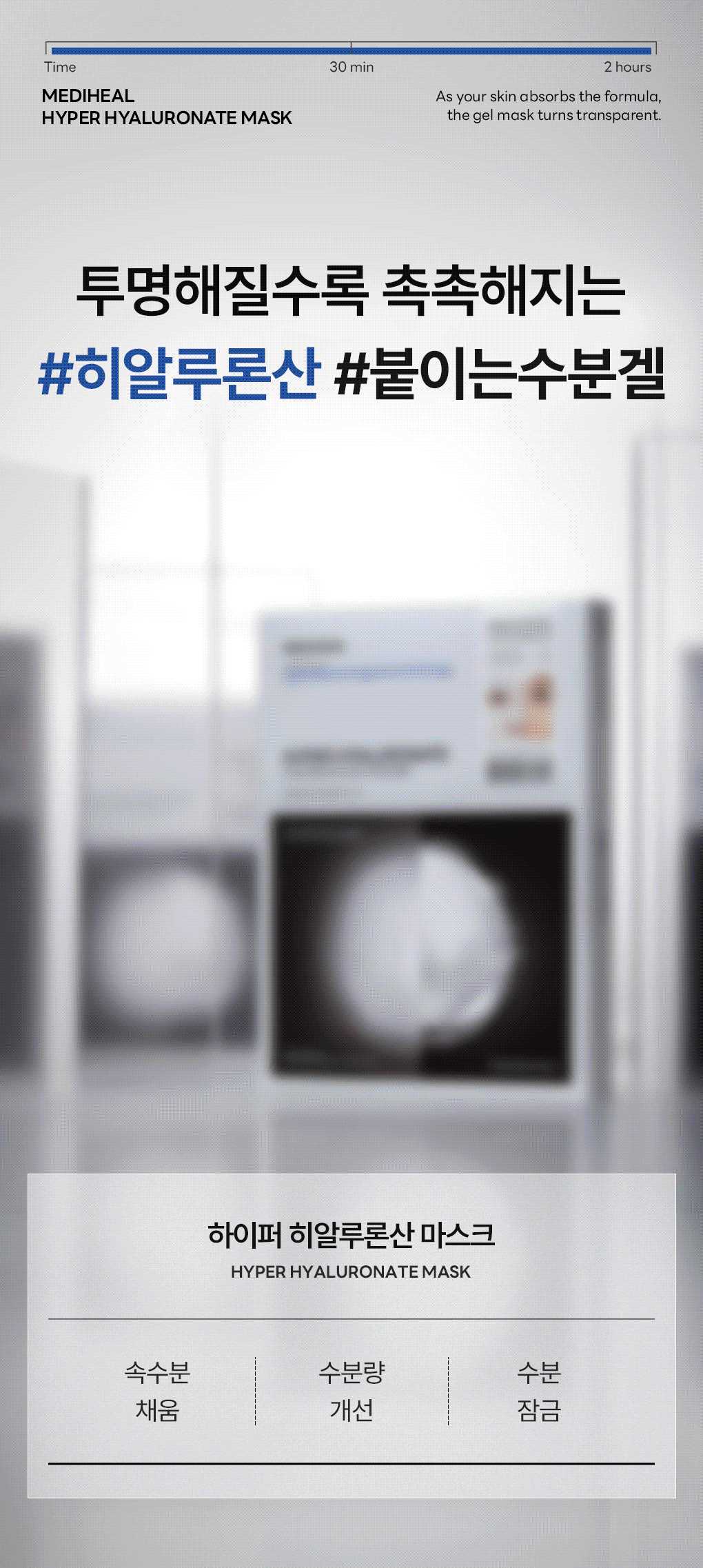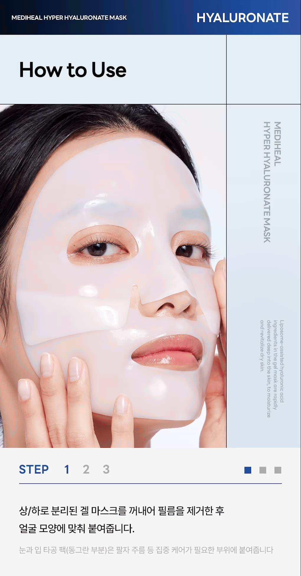 Experience intensive hydration in just one sheet mask. The MEDIHEAL Hyper Hyaluronate Mask features ultra-fine hyaluronic acid capsules—measuring approximately 186nm, smaller than pores—for rapid and deep absorption into the skin.