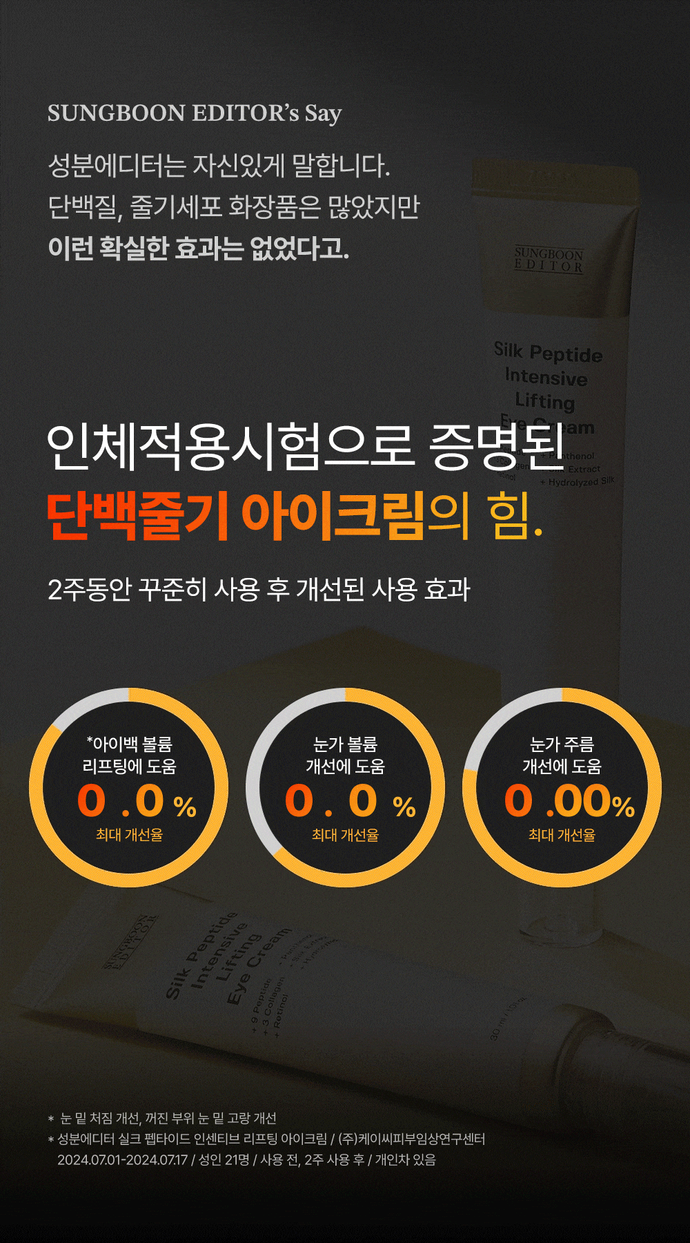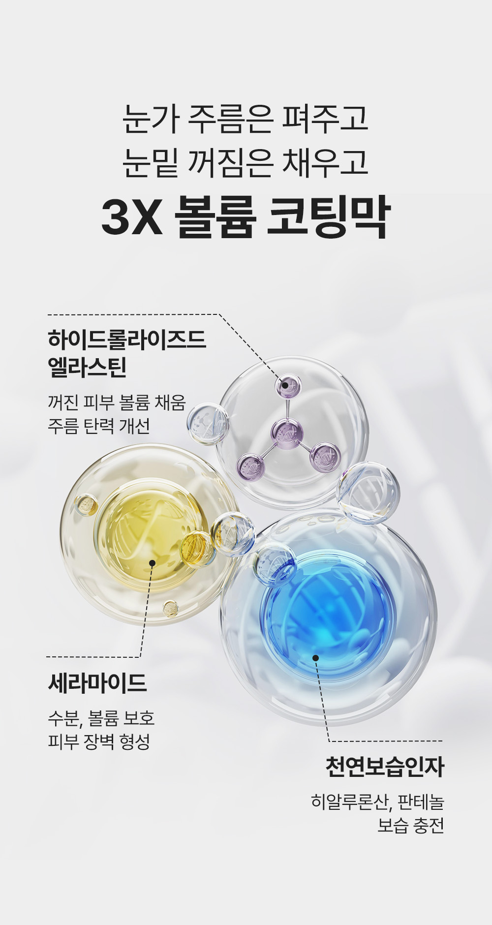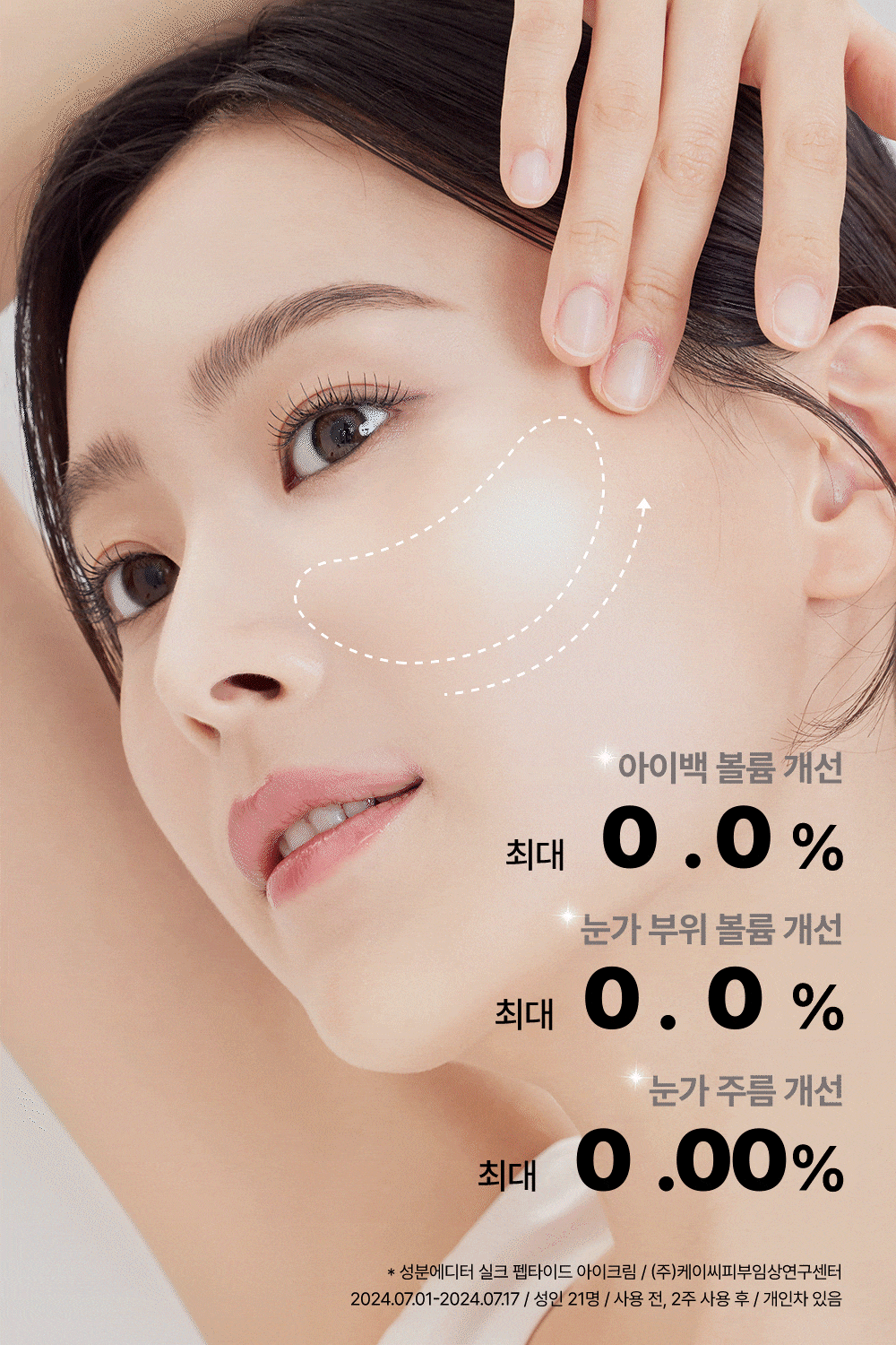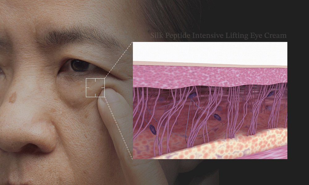 Lifts sagging skin by tightening the “elastic band” structure under the eyes, visibly firming and smoothing.
