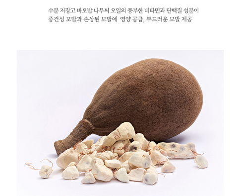 Abundant vitamins and protein ingredients of baobab seed oil, a water storage reservoir, provide nutrients to dry and damaged hair and provide soft hair.