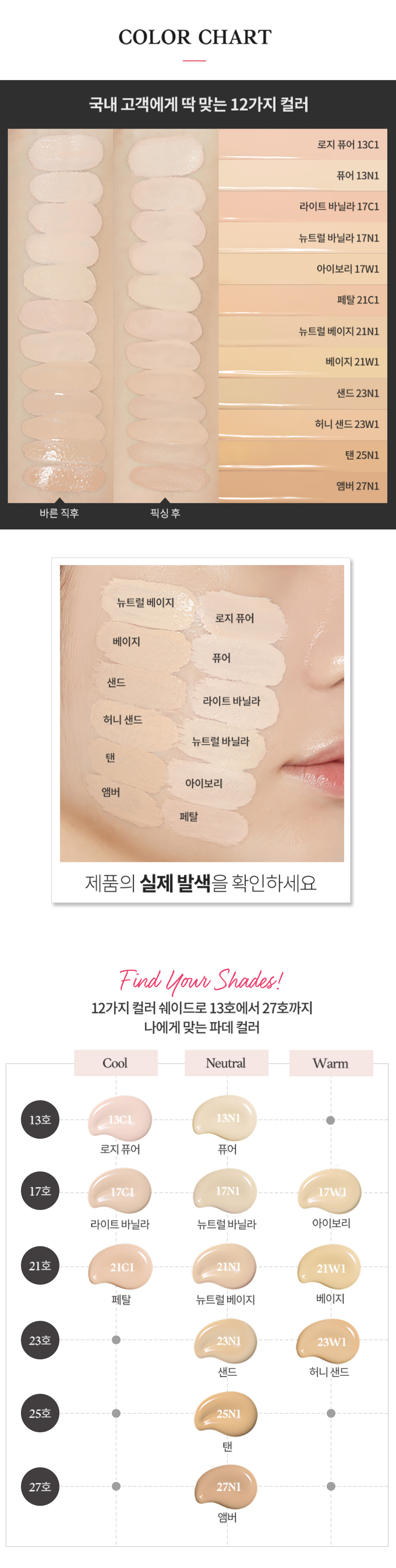 The ETUDE Double Lasting Foundation offers a comprehensive range of 12 diverse shades, meticulously developed to fit various skin tones and undertones just right. Whether you have cool (C), neutral (N), or warm (W) undertones, you’ll find your ideal match for a seamless blend and a truly natural look. Explore our detailed shade guide below to discover the perfect hue for your complexion.