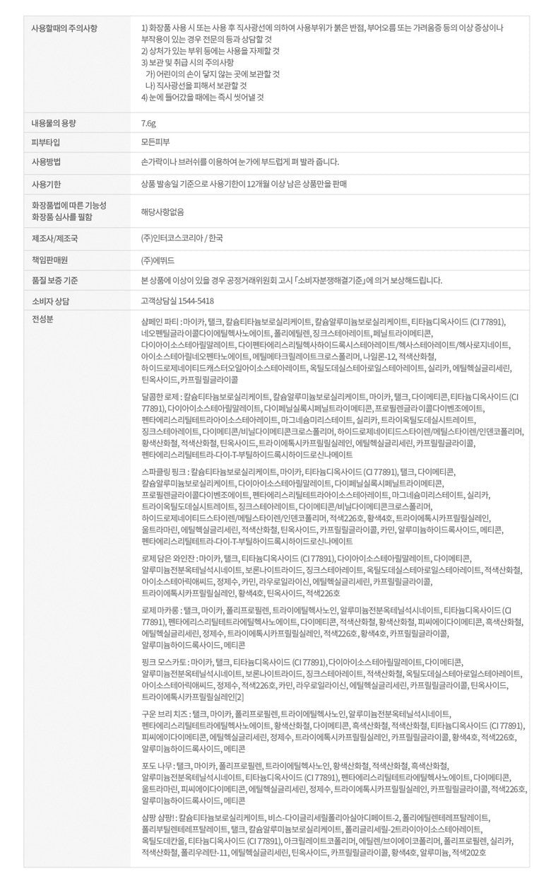 The soft, adhering matte and shimmer texture is composed of a brilliant jelly glitter texture without powderiness.