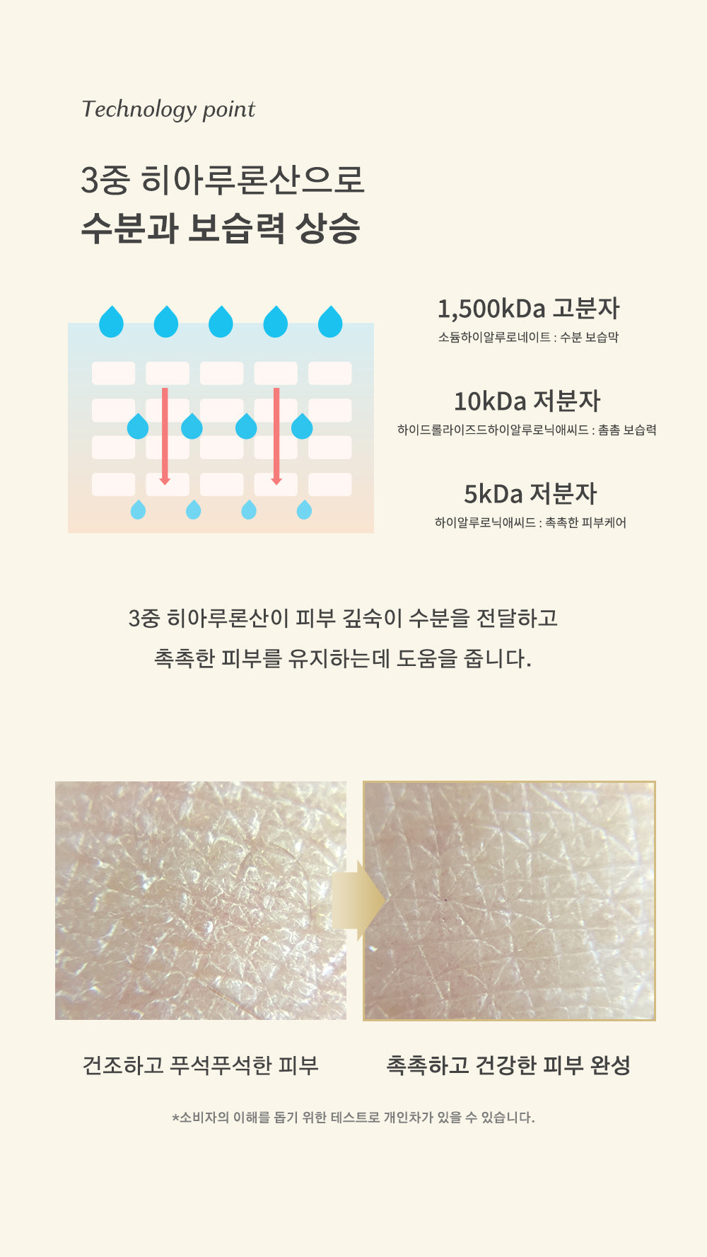 - Triple Hyaluronic Acid: A trio of hyaluronic acids that work synergistically to hydrate, retain moisture, and ensure firm, cared-for skin.