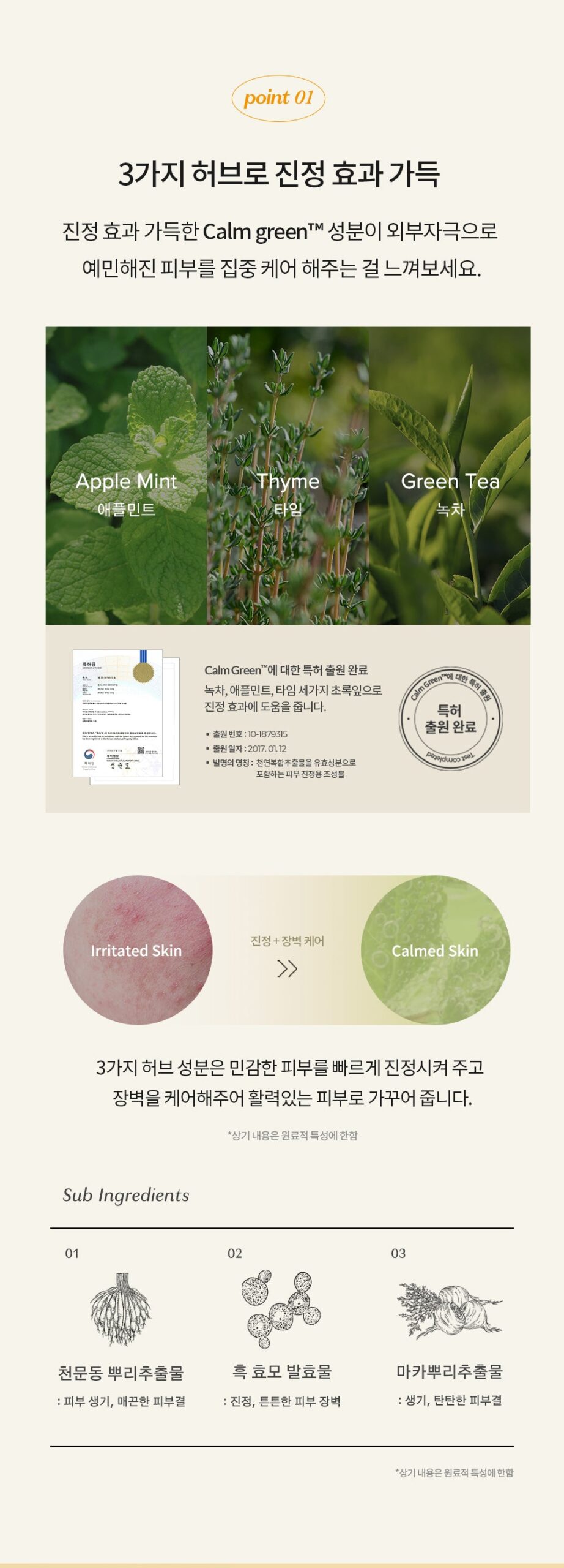 - Calm Green™ Technology: A patented innovation (Patent 10-1879315) that delivers intensive care specifically designed for sensitive skin.