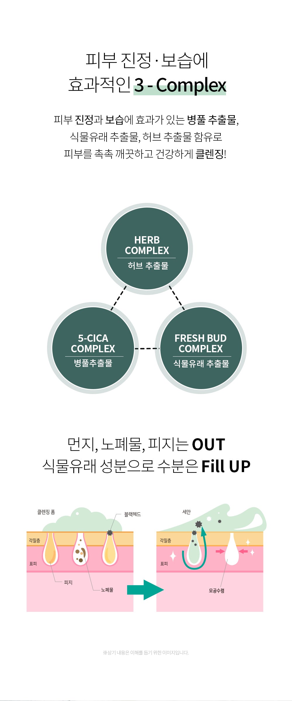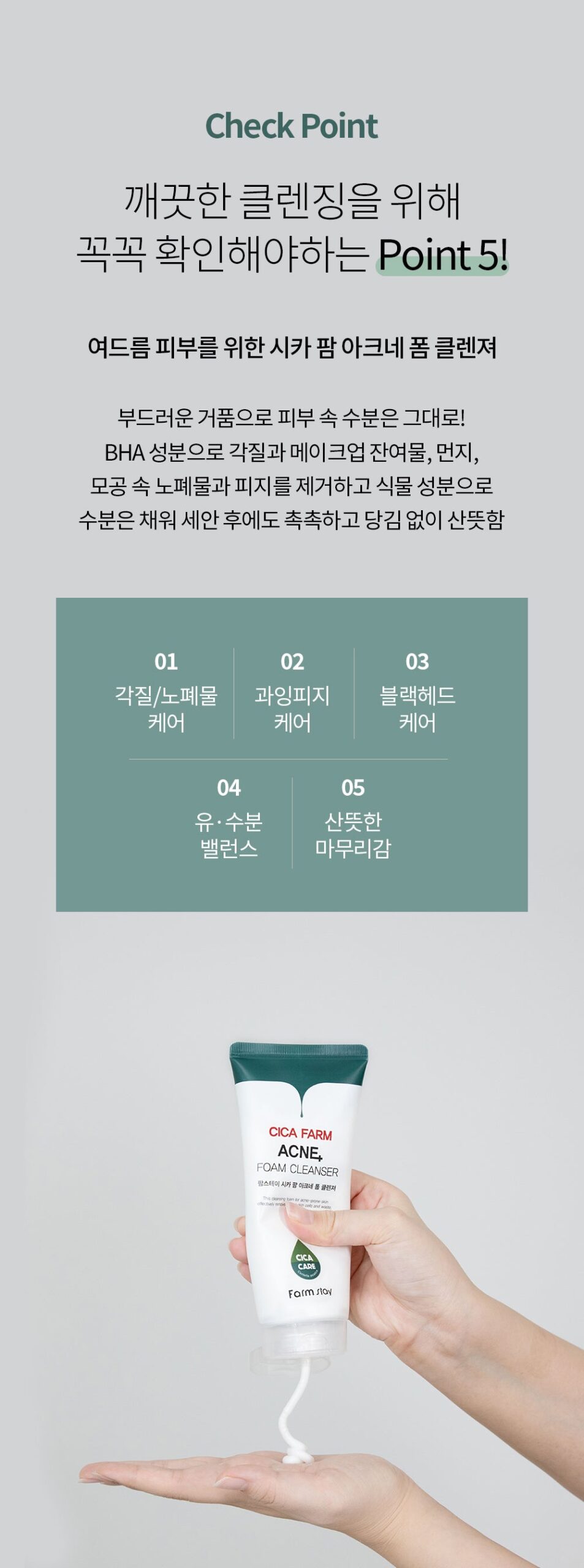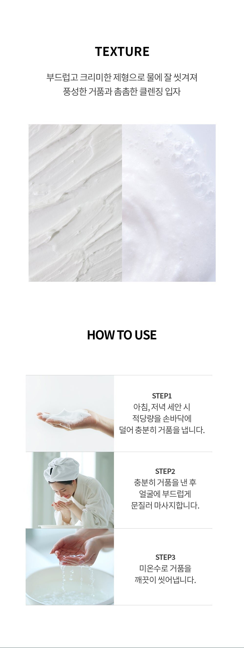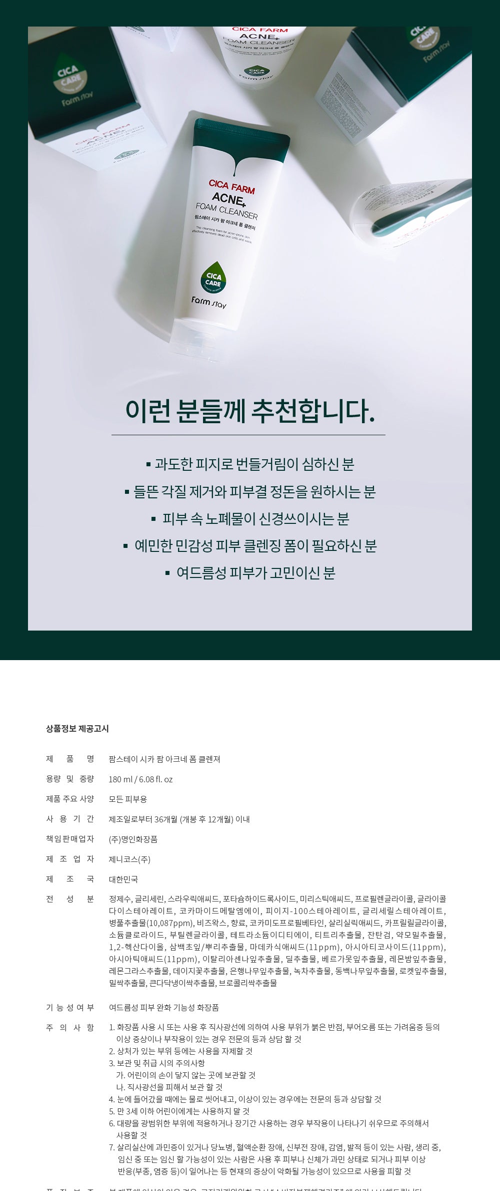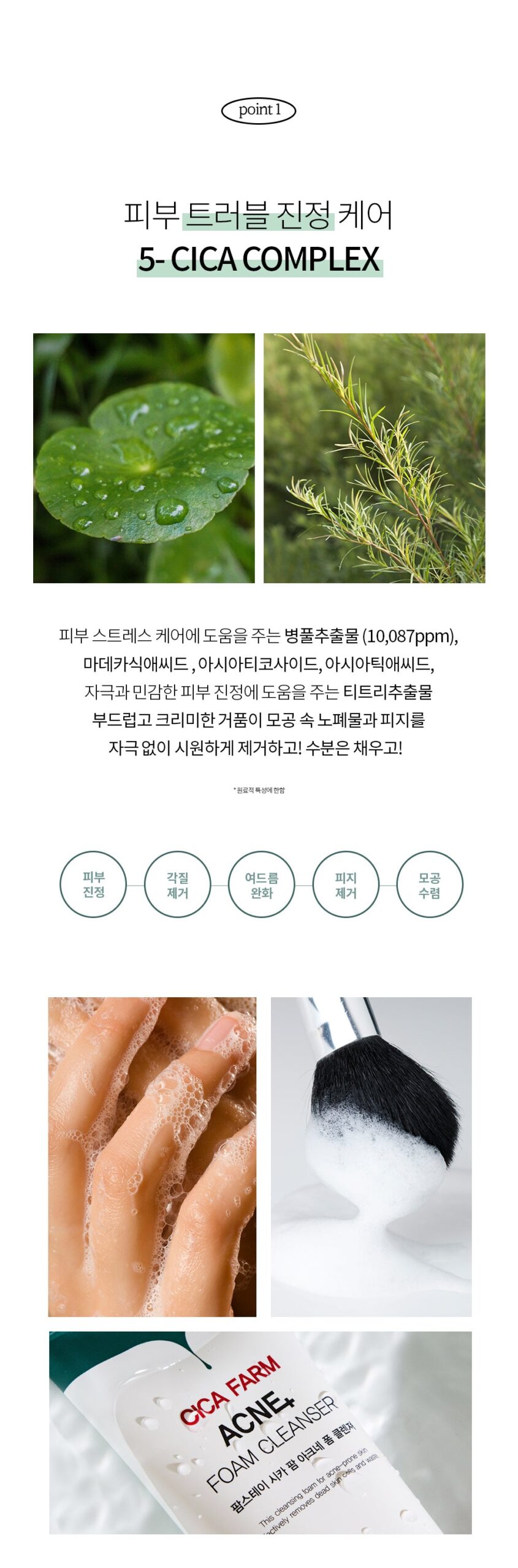 Centella asiatica extract (10,087ppm), madecassic acid, asiaticoside, asiatic acid to help care for skin stress, tea tree extract to help soothe irritated and sensitive skin Soft and creamy foam stimulates waste and sebum in pores Remove it coolly without it! Replenish moisture!