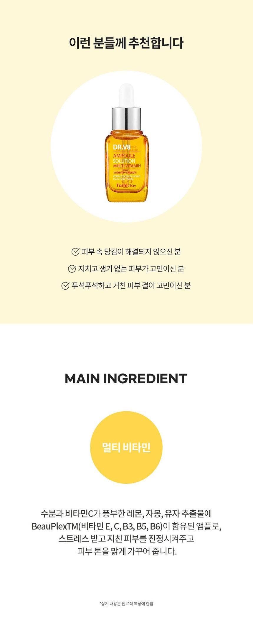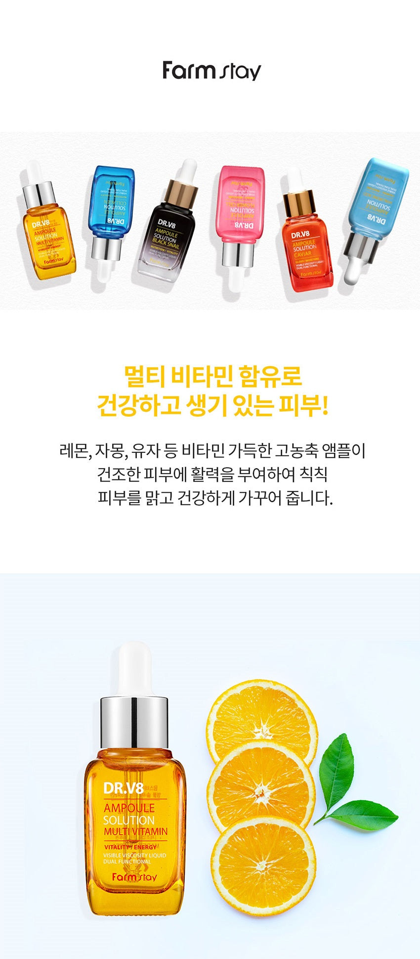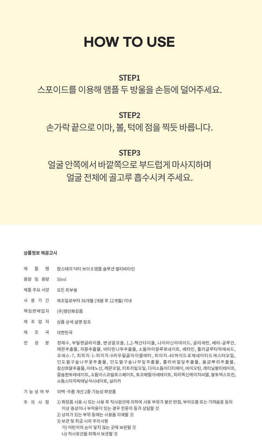 Highly concentrated ampoule full of vitamins such as lemon, grapefruit, and citron gives vitality to dry skin and makes dull skin clear and healthy.