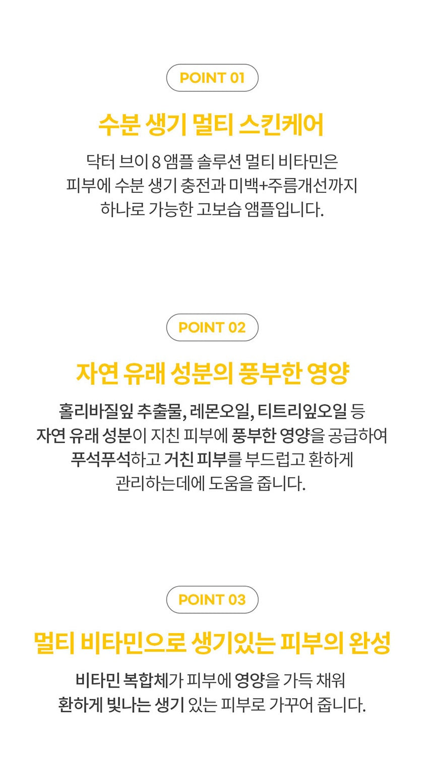 Dr. V 8 Ampoule Solution Multi Vitamin is a high-moisturizing ampoule that can revitalize the skin and provide whitening + wrinkle improvement all in one.