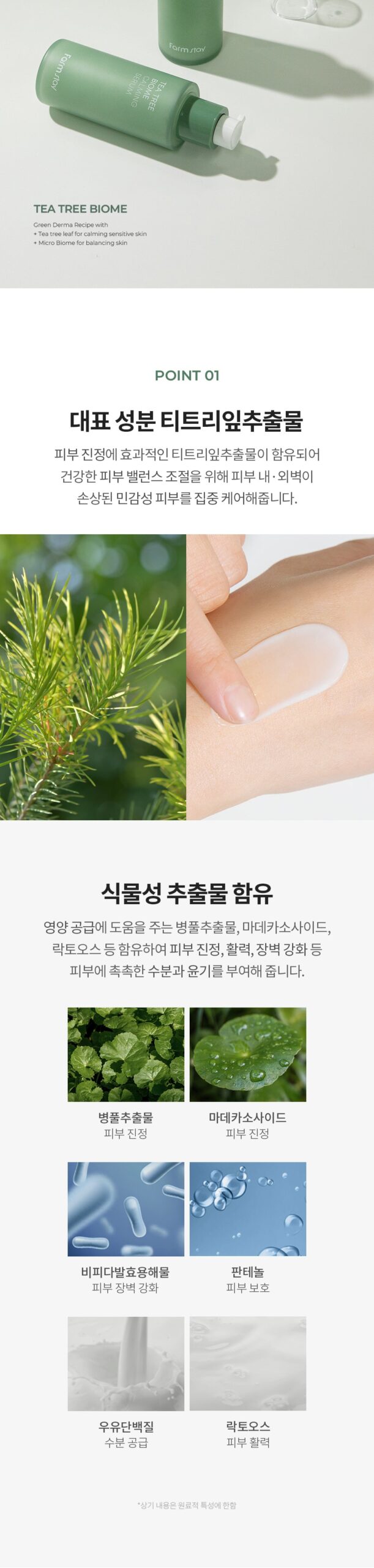 Contains tea tree leaf extract, which is effective for skin soothing, and provides intensive care for sensitive skin with damaged inner and outer skin to control healthy skin balance.