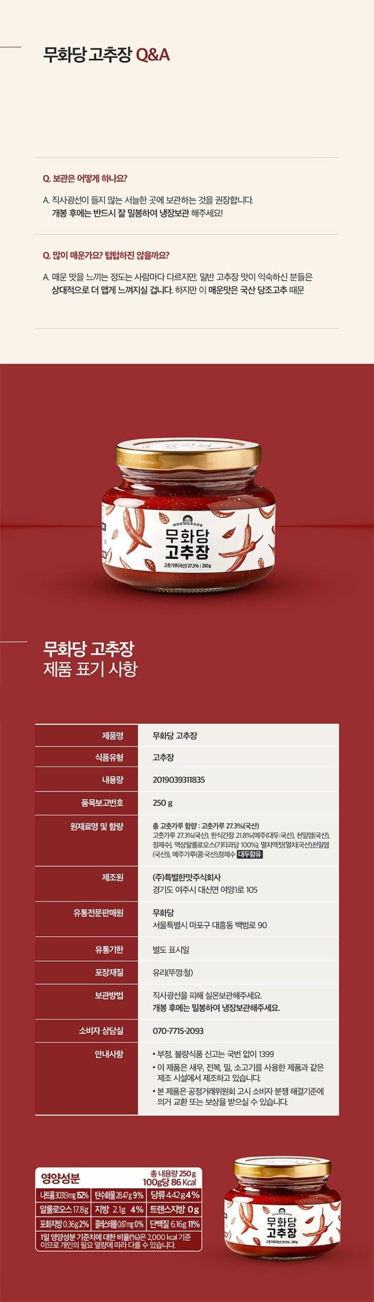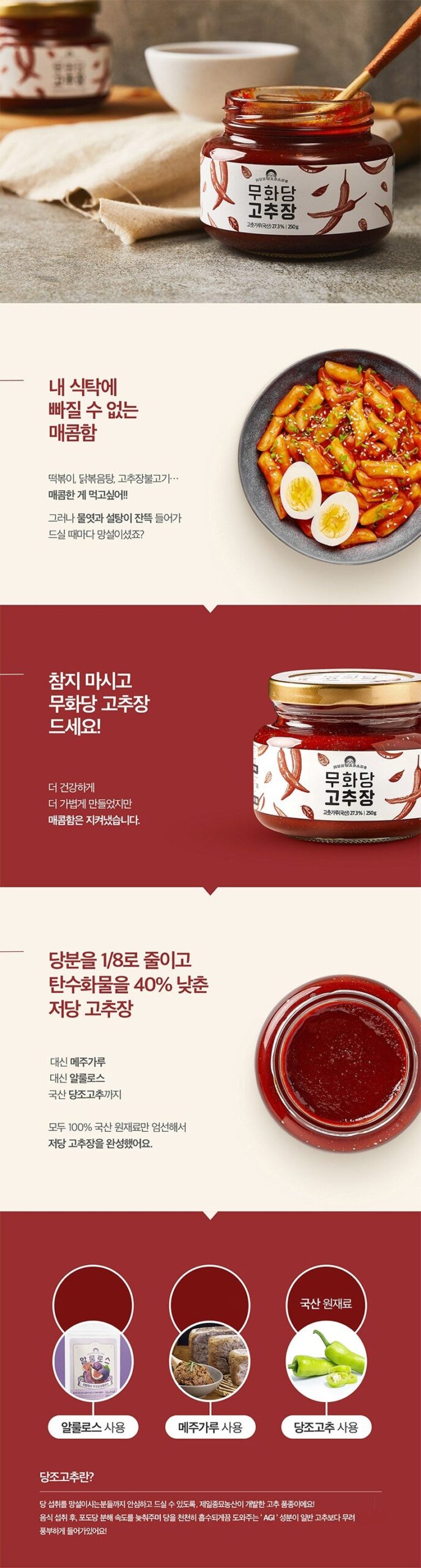 We’ve substituted soybean flour with allulose, a healthier alternative. All of our ingredients are 100% domestically sourced, chosen with care to produce this low-sugar red pepper paste.