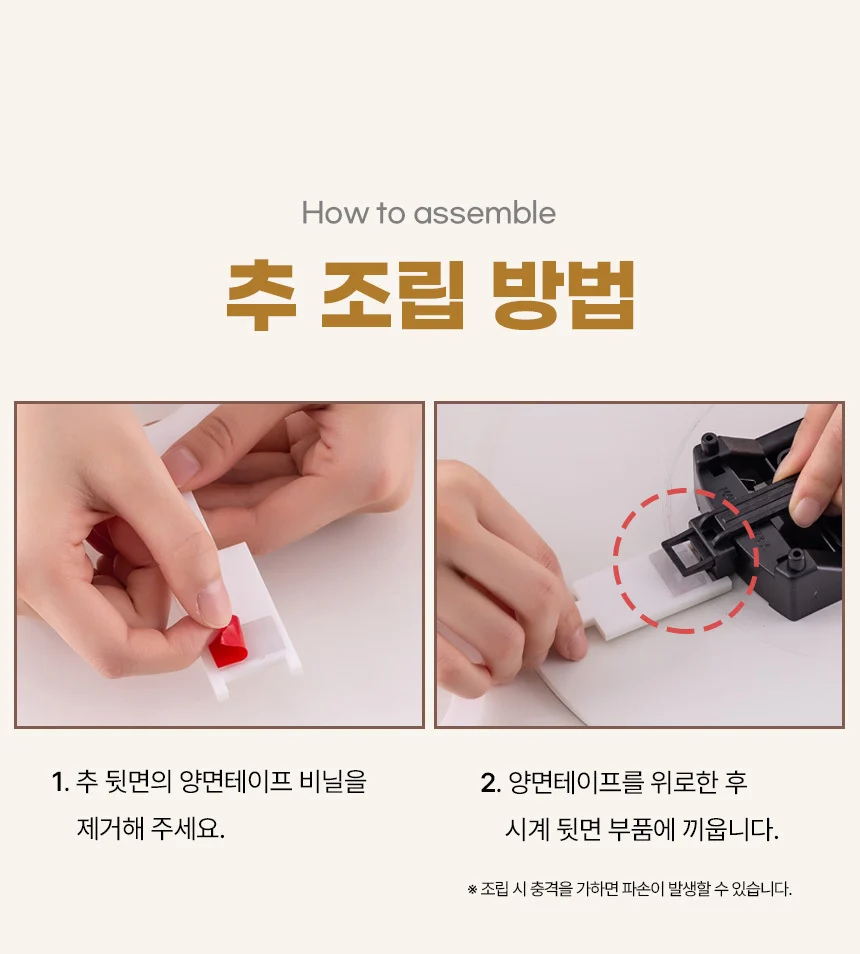 With the tape facing upward, attach the pendulum to the back of the clock.