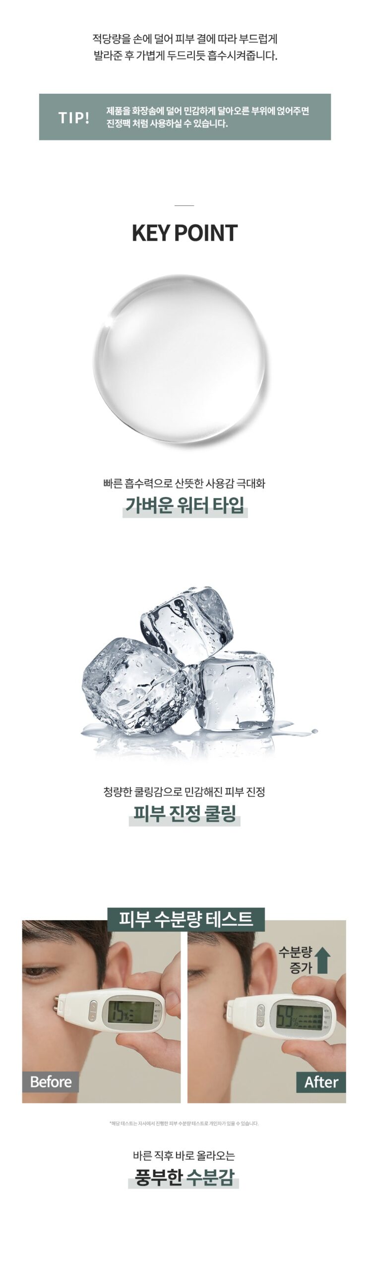 - Fast Absorption: Light, water-type texture that soothes sensitive skin with a cooling sensation.