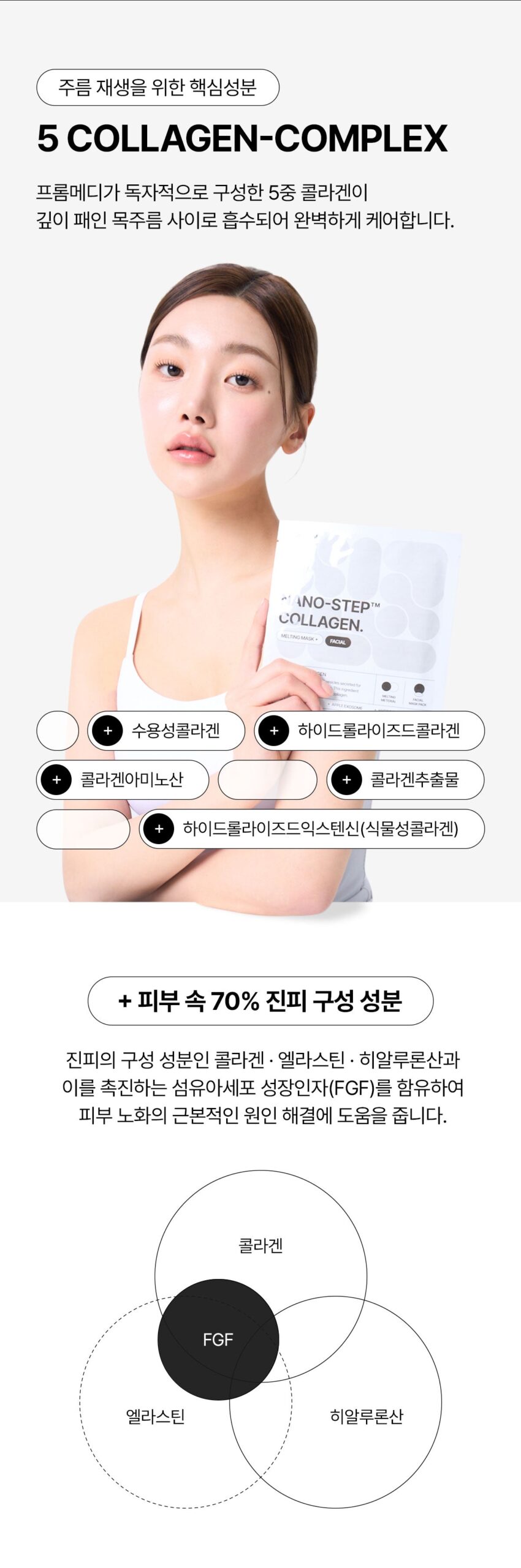 These ingredients, which constitute 70% of the dermis components, are combined with elastin, hyaluronic acid, and FGF to combat the root causes of skin aging.