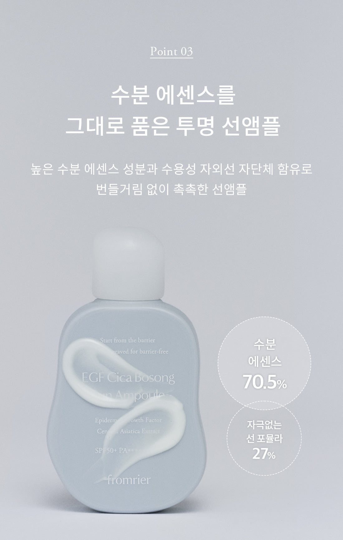 Packed with 70.5% high-moisture essence, this sun ampoule not only shields your skin but also hydrates it deeply. The water-soluble UV protection ingredients ensure your skin stays moist without any greasy shine.