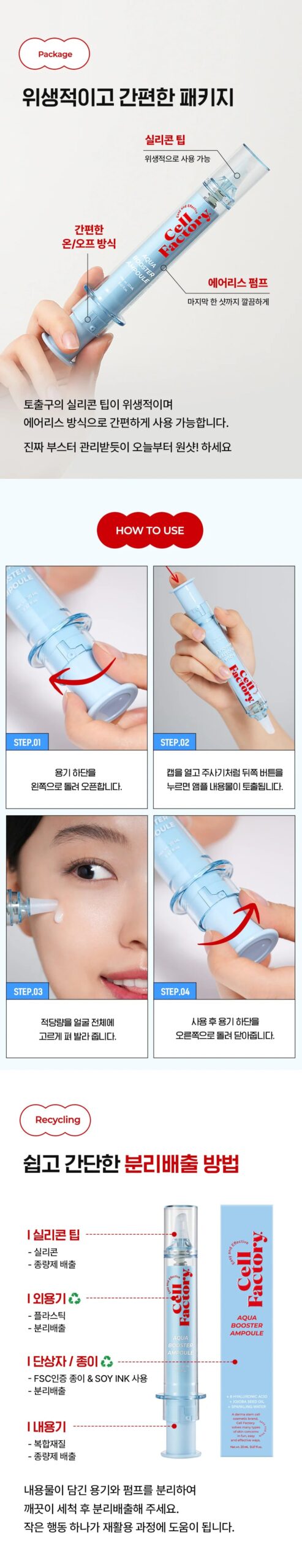 The 8-layer hyaluronic acid moisture refill ion ampoule is a unique formulation that takes care of moisture and elasticity deep into the skin. It quenches skin’s thirst by adding liposome-resurrected hematopoietic stem cell culture medium and carbonated water at a powerful concentration of 20,000ppm, and is precisely applied in a user-friendly syringe-type container.