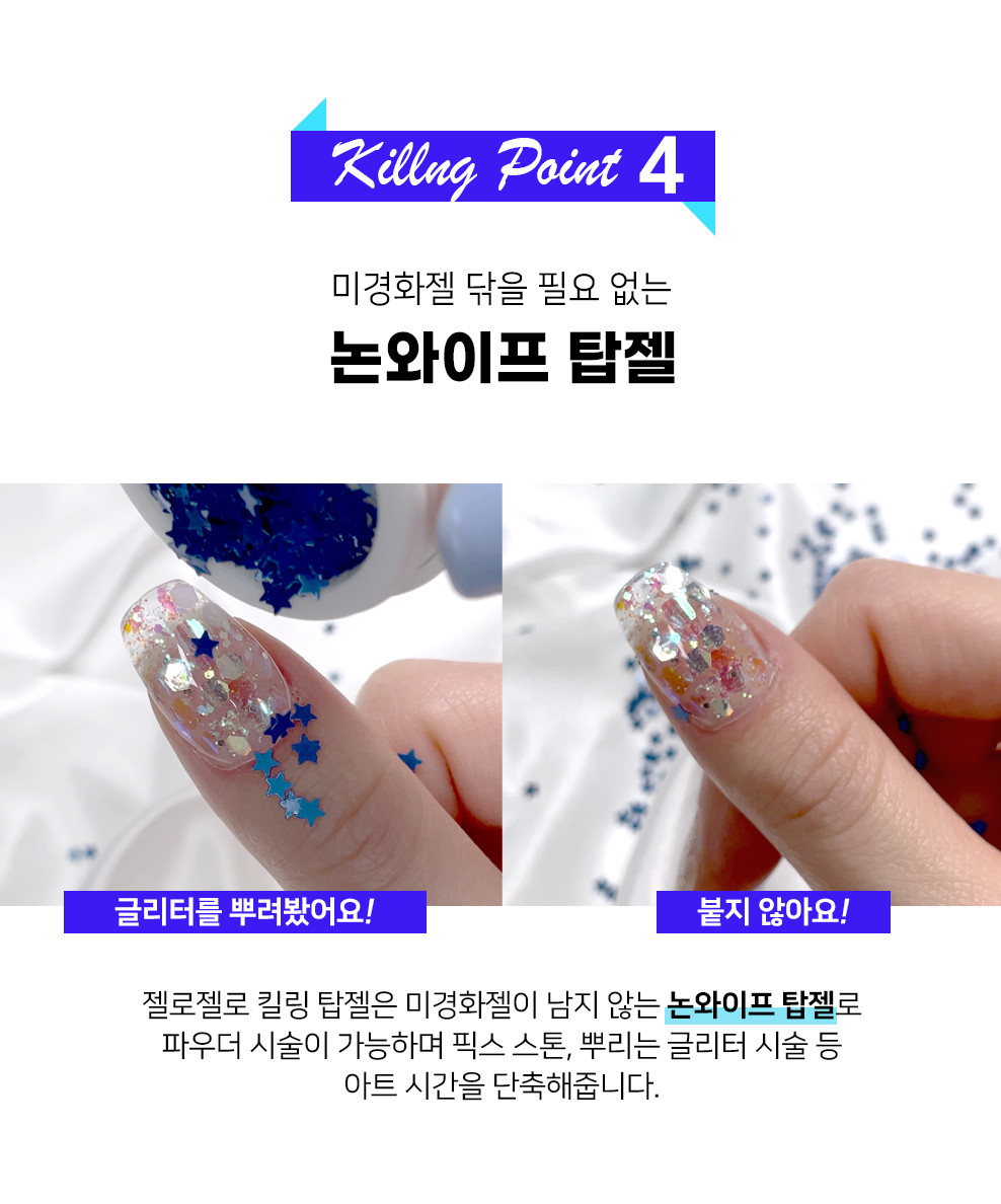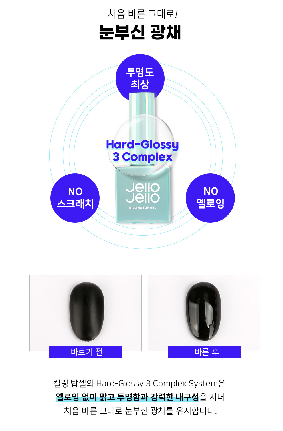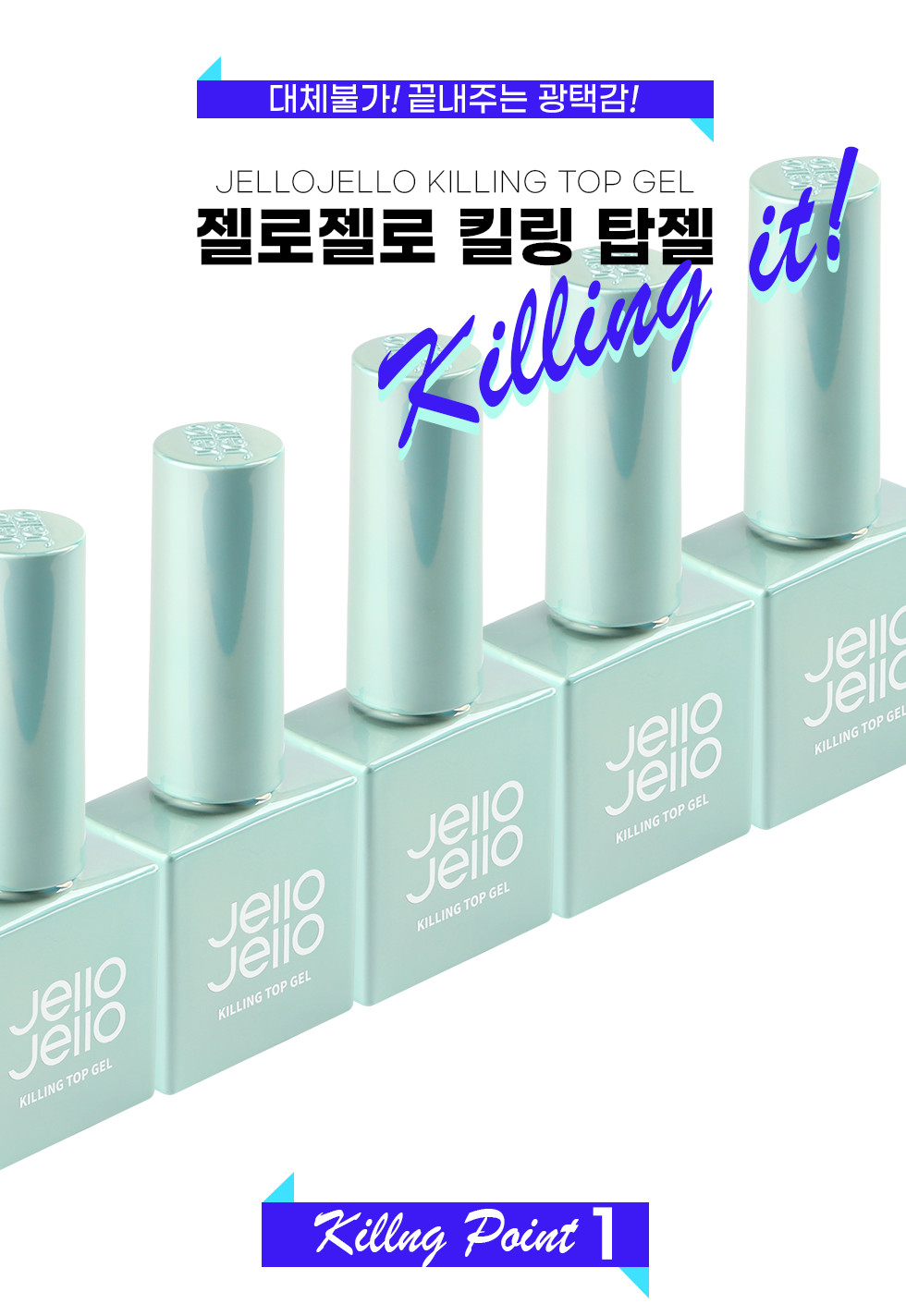 A premium non-wipe top gel from Korean brand JelloJello that delivers exceptional shine and long-lasting protection for your gel nail art. This killing top gel provides a glass-like finish without the need to wipe off uncured residue after curing.