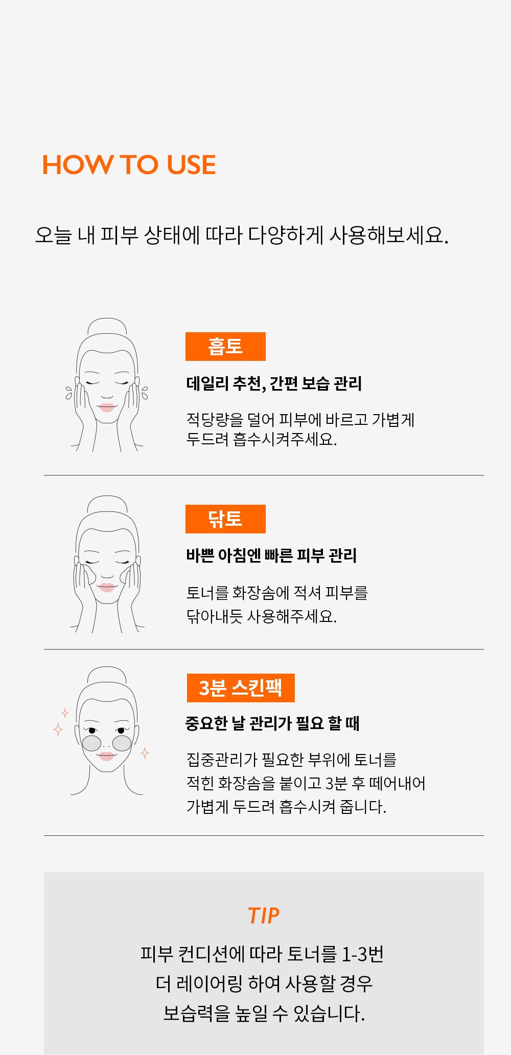 - 3-Minute Skin Pack: Soak cotton pads with the toner and place them on areas requiring intensive care. Leave on for 3 minutes, then remove and pat the remaining product into the skin for maximum absorption.