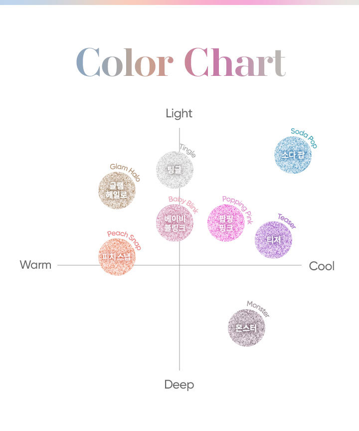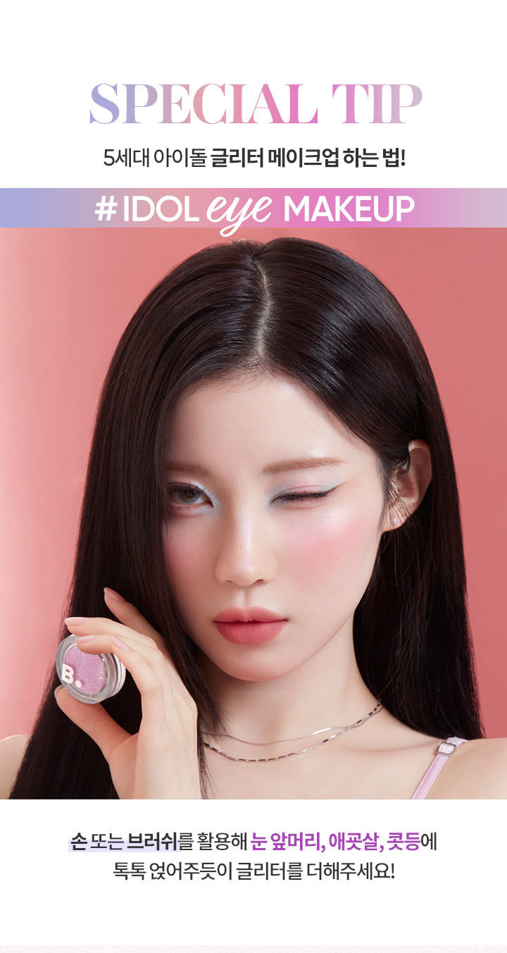 Capture the spotlight with our metallic color glitter that shines transparently. It’s the secret behind the dazzling makeup of the 5th generation K-pop idols! The glitter can be easily applied on your eyelids, inner corners of your eyes, or down the bridge of your nose using either your fingers or a brush.