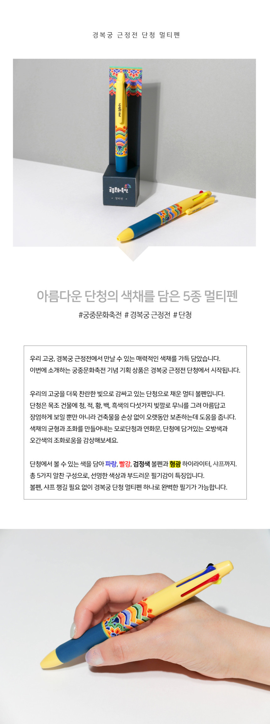 Discover the charm of traditional Korean artistry with the Gyeongbokgung Dancheong Multi Pen, a five-in-one writing tool infused with the vivid colors and cultural essence of the Geunjeongjeon Hall in Gyeongbokgung Palace. Featuring authentic Dancheong patterns—symbolizing good fortune and protection—this pen embodies both beauty and functionality.