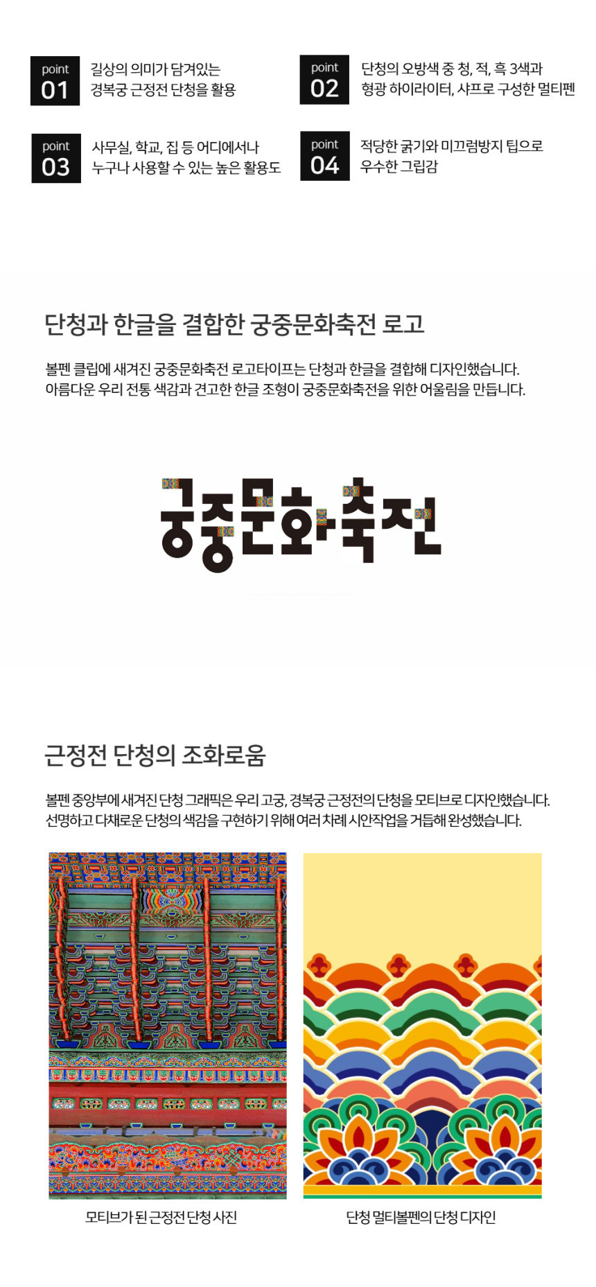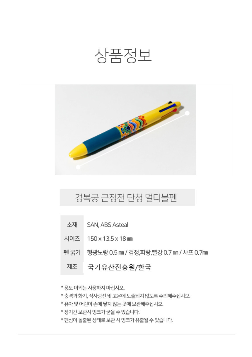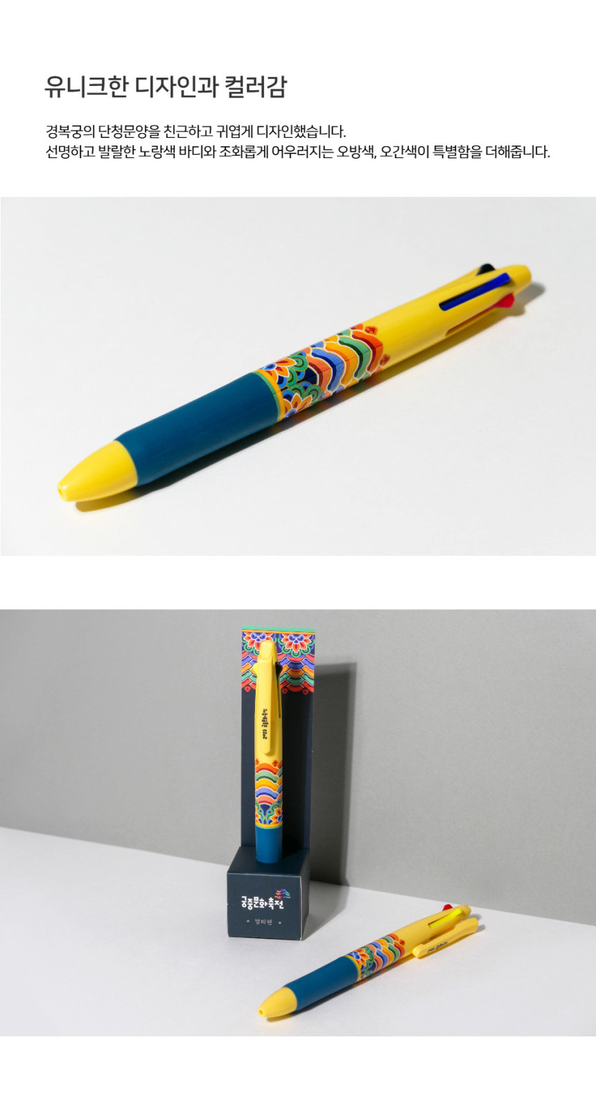 The pen’s center showcases a beautifully engraved Dancheong pattern, directly inspired by Gyeongbokgung Palace’s ornate architectural details. The bright yellow body combined with a vibrant harmony of Korea’s five cardinal colors—blue, red, yellow, white, and black—creates a visually stunning, culturally rich design.