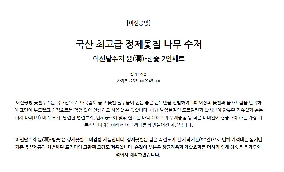 The LEESHIN spoon and chopstick set is meticulously handcrafted in Korea using premium domestic hardwood, carefully selected for its fine grain and excellent absorption of Ottchil (Korean lacquer). Each piece is coated and polished through more than nine rounds of Ottchil and water sanding, resulting in a smooth, elegant surface. You can use it with confidence, free from concerns about endocrine disruptors or harmful chemicals.