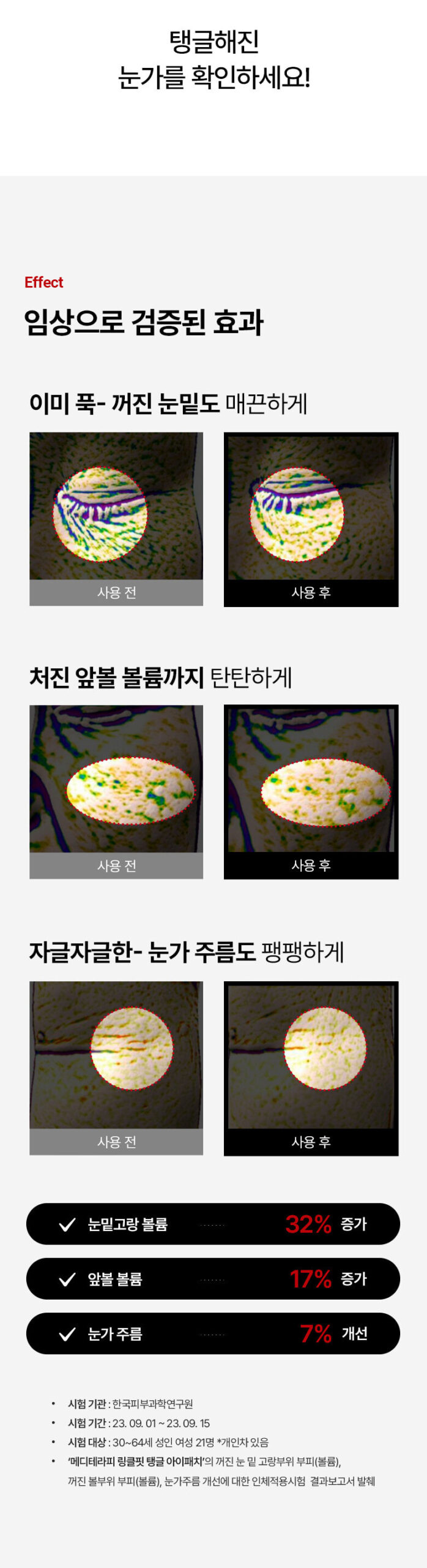Even severely sunken under-eyes appear plumped, front cheek sagging is visibly firmed, and fine lines are noticeably reduced.