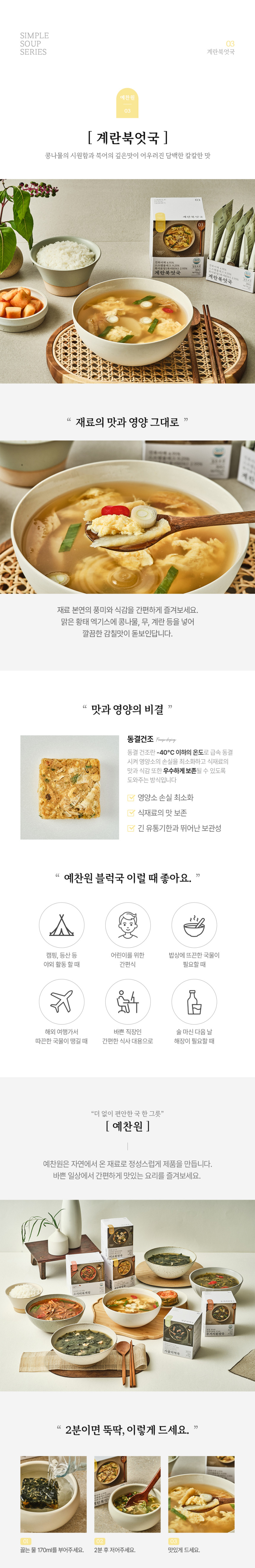 Yechanwon carefully crafts products from natural ingredients, embodying a deep care for quality. We invite you to enjoy delicious and nutritious meals conveniently in your busy daily life.