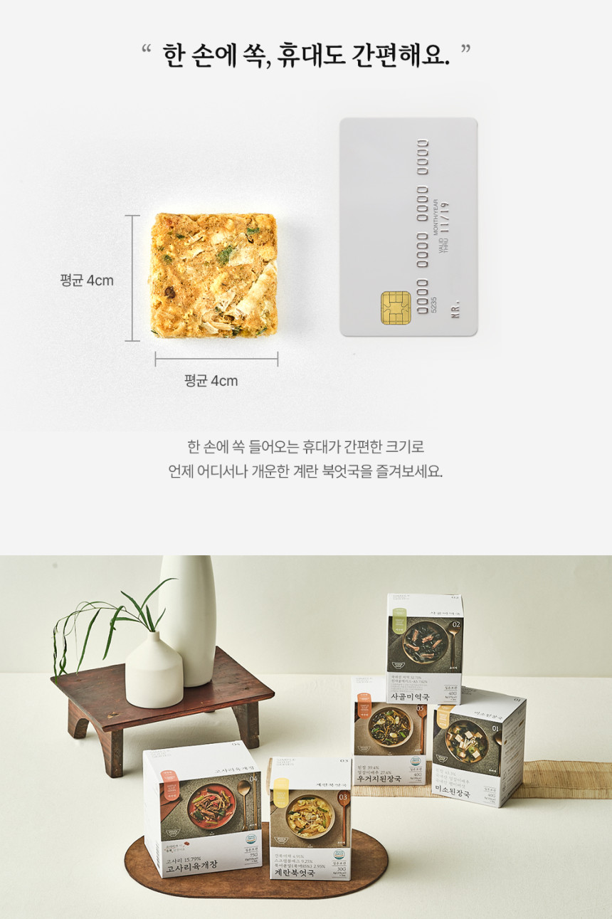 Ingredients: Purified Water, Dried Pollack 27.4% (Russia), Egg 15.1% (Korea), Radish 8.3% (Korea), Dried Onion (China), Dried Green Onion (Korea), Whole Egg Powder (Korea), Anchovy Fish Sauce, Roasted Seasoning Powder, Garlic, Red Crab Extract, Dried Garlic, Roasted Sea Salt, Freeze-Dried Green Onion, Flavor Enhancer Powder, Black Pepper.