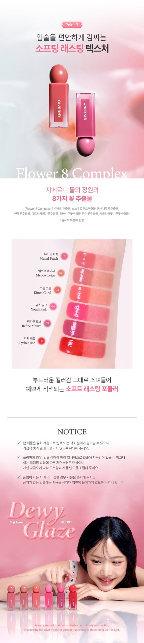 Oh man, the GIVERNY Dewey Lip Glaze is something special! The formulation features some solid ingredients like shea butter and jojoba oil, which work wonders in moisturizing your lips. It’s a treat putting it on – you can literally feel that nourishment happening. I layered shades 03 and 04 to get this fresh look; the color payoff really does adapt beautifully across seasons! What’s impressive too is how it’s non-sticky yet gives that dewy finish. You don’t usually find products that marry hydration with vibrant color so seamlessly – hats off to them for this one!
