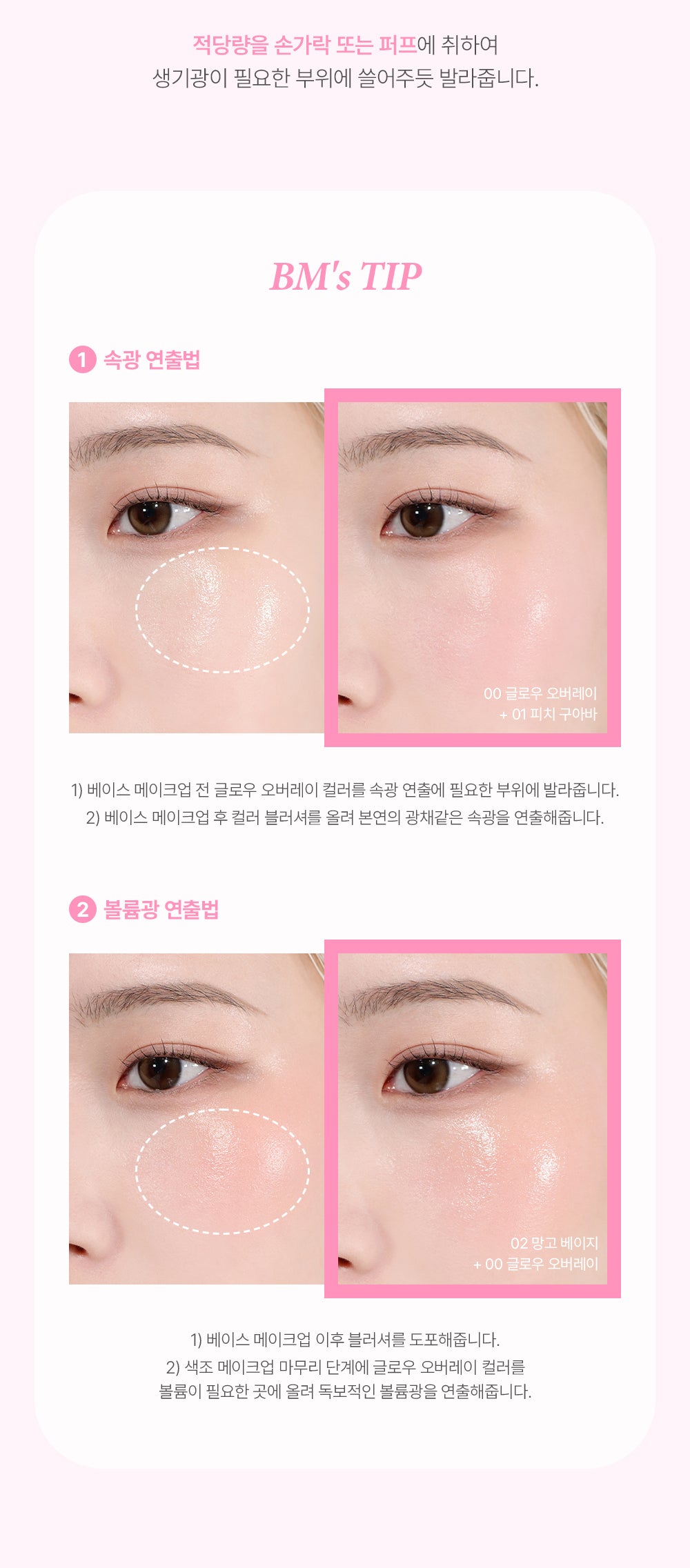 - Before applying your base makeup, use the glow overlay color on areas where you want to enhance the inner glow.