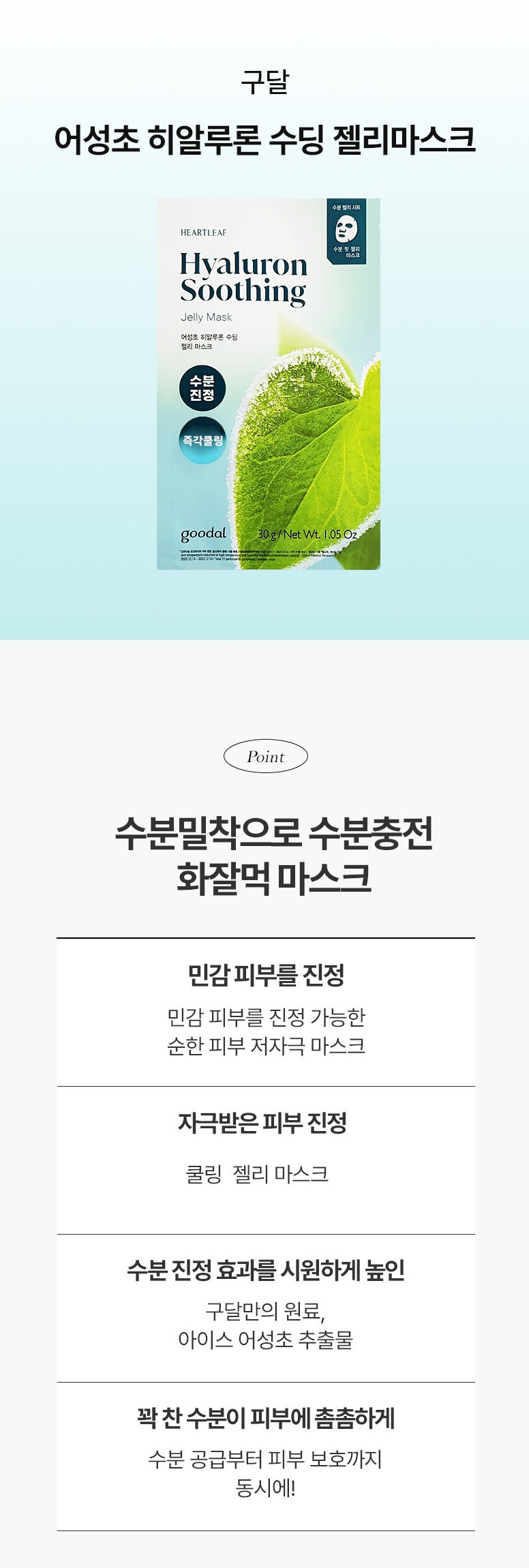 The Goodal Houttuynia Cordata Hyaluron Soothing Jelly Mask is a calming sheet mask that effectively soothes sensitive skin and strengthens skin barrier. Infused with Ice Houttuynia Cordata Extract and Hyaluronic Acid to replenish moisture deep within the skin barrier, leaving your complexion soft and refreshed. The jelly-like mask sheet made from natural plants helps nutrients to be highly adhered to the skin for thorough absorption, while keeping your skin hydrated.