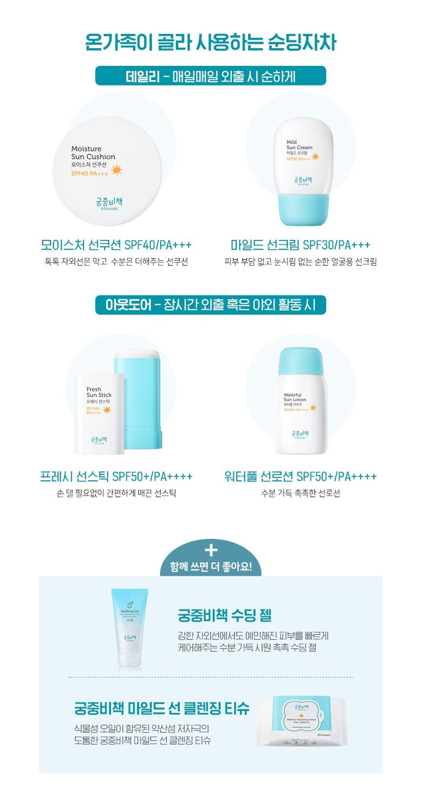 In the case of children, since their skin is thin and the amount of melanin is small, tans, erythema, and burns can easily occur when exposed to strong UV rays for a long time. In addition, it is important to take immediate care of the skin stimulated by UV rays by using a gel or lotion product with a cooling effect & high moisture content, or a soothing product.
