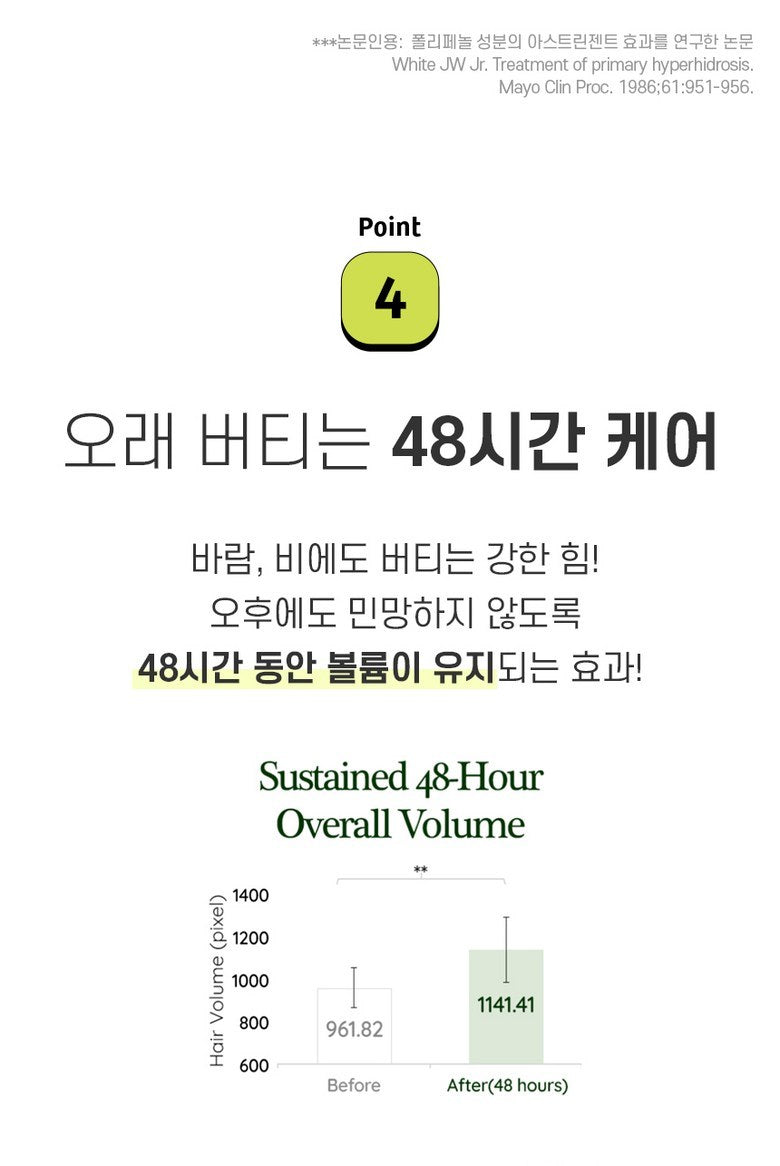 Developed using cutting-edge KAIST technology, this product is commercialized by Polyphenol Factory, a KAIST faculty startup. The patented LiftMax308™ technology delivers exceptional volume and strength to fine hair.