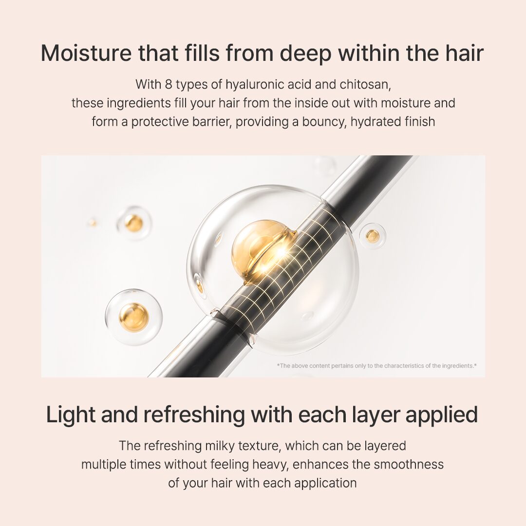 8 types of hyaluronic acid & chitosan ingredients fill the hair with moisture and form a protective film to give you moist hair.