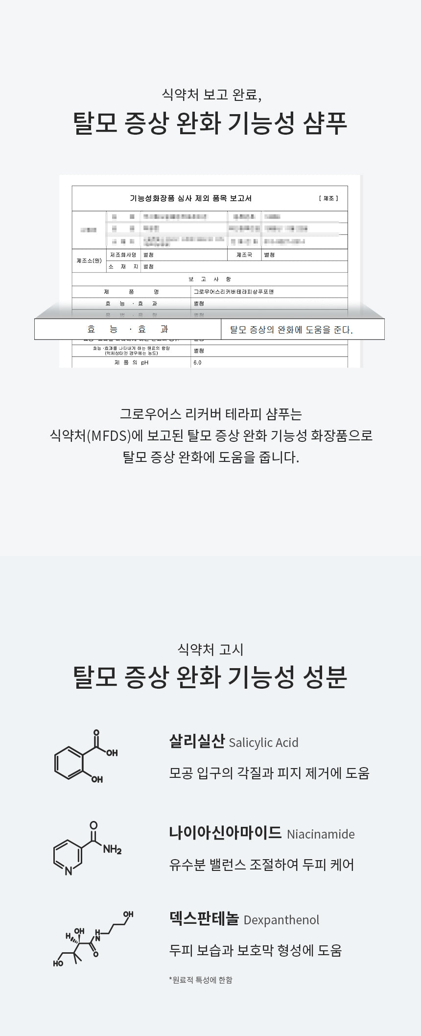 Approved by the Korean Ministry of Food and Drug Safety (MFDS), this shampoo features hair loss care properties with the following active ingredients: