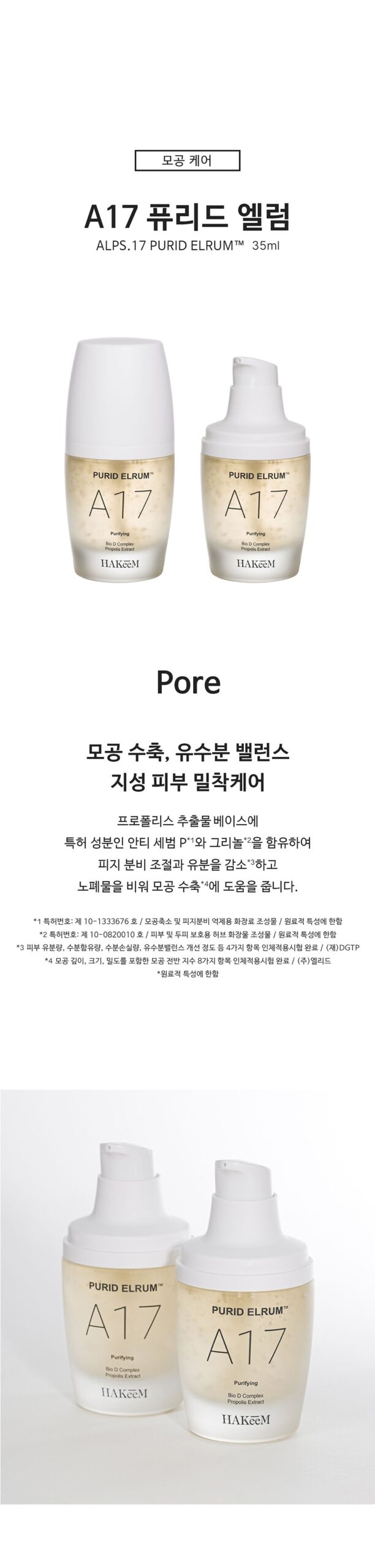 HAKeeM A17 PURID ELRUM™ is a comprehensive pore-care solution that helps you achieve balanced, clear, and refreshed skin with its patented, eco-friendly formulation. Perfect for oily and combination skin types.
