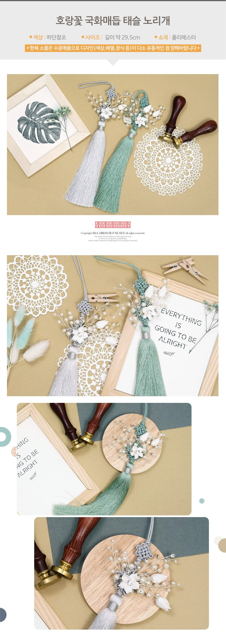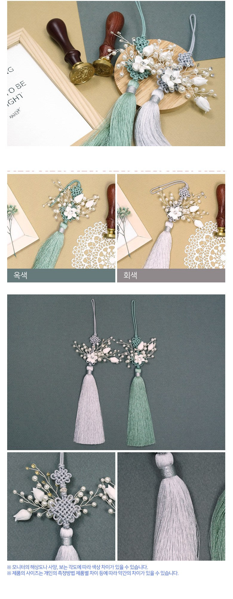 Each Hanbok accessory, including Norigae, is meticulously handcrafted. Due to this artisanal process, the design elements such as color, arrangement, and decoration may vary slightly, making each piece unique.