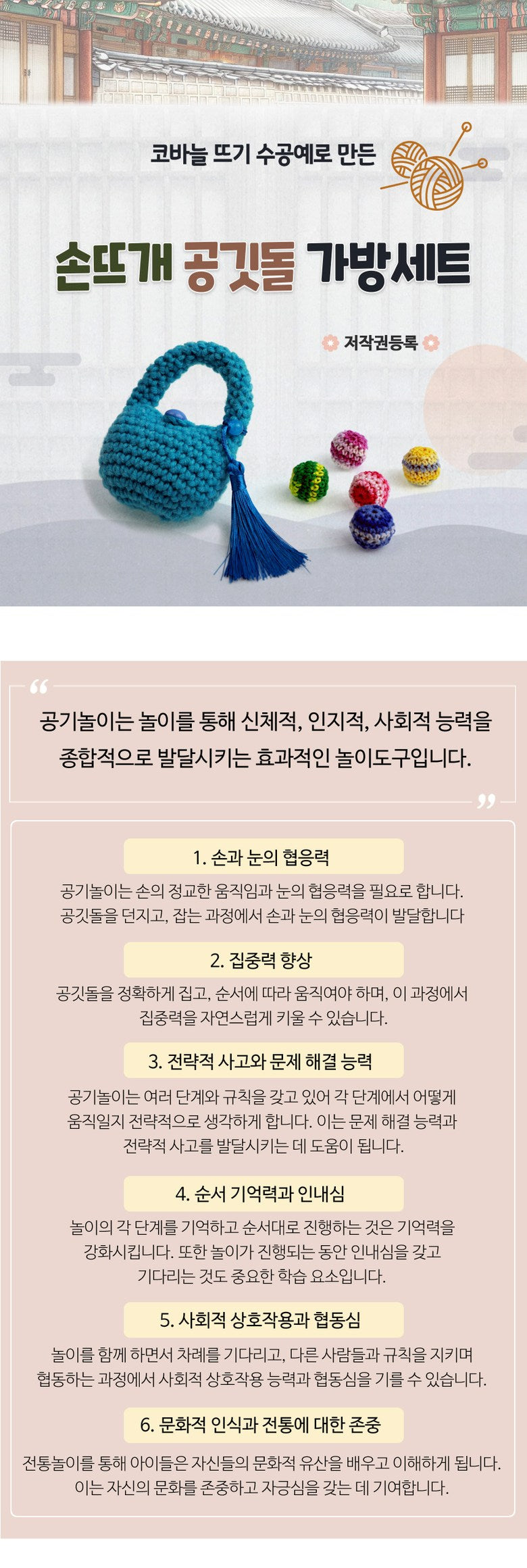 Elevate your playtime with our hand-knitted Gonggi set, crafted with care using crochet techniques. This Korean traditional game is more than just fun—it’s a tool to enhance physical, cognitive, and social skills.