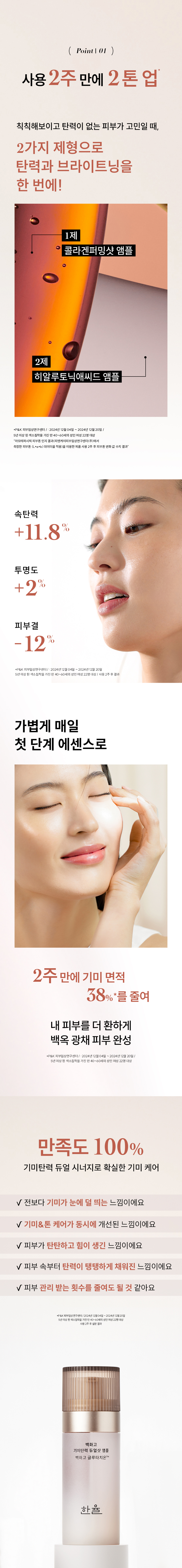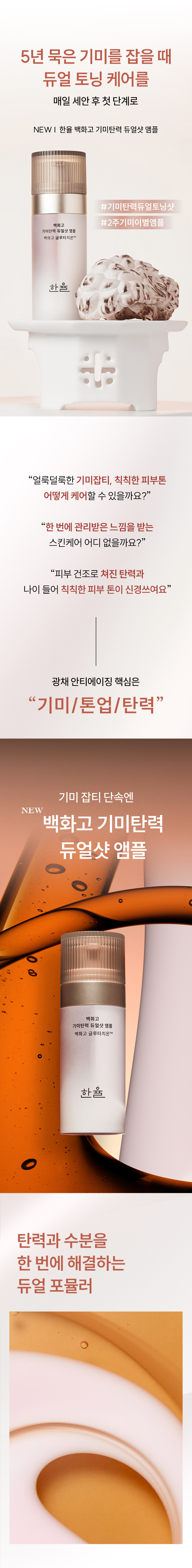 The core of radiant anti-aging lies in targeting Blemishes, Tone-up, and Elasticity simultaneously. HANYUL’s NEW Baekhwago Blemish & Elasticity Dual Shot Ampoule delivers a powerful dual formula to resolve elasticity and moisture concerns all at once.