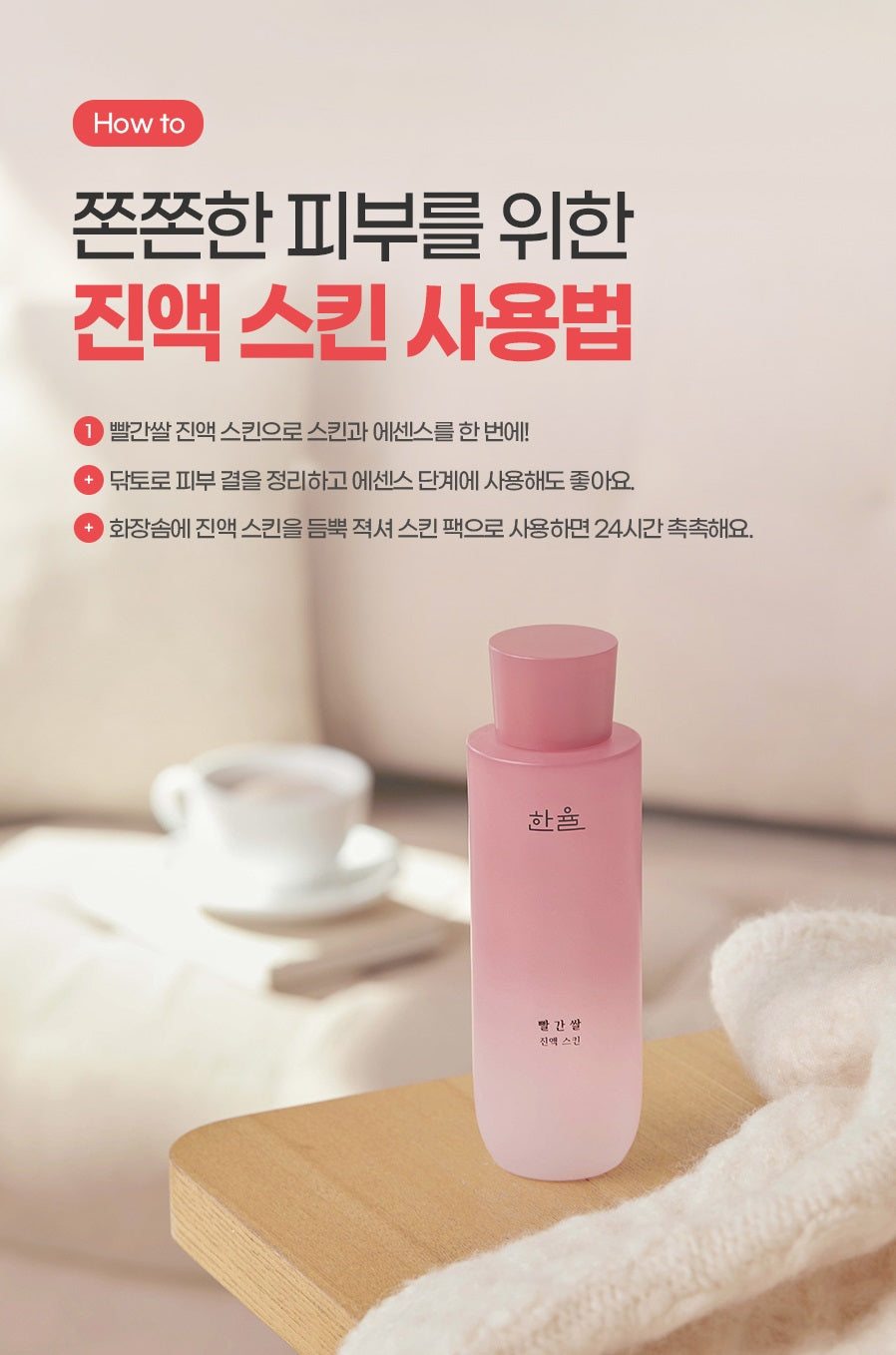 Normally, viscous toners do not absorb well, but Hanyul Essence Toner absorbs well, so the inside is moist and the outside is smooth without stickiness, so I really like it.