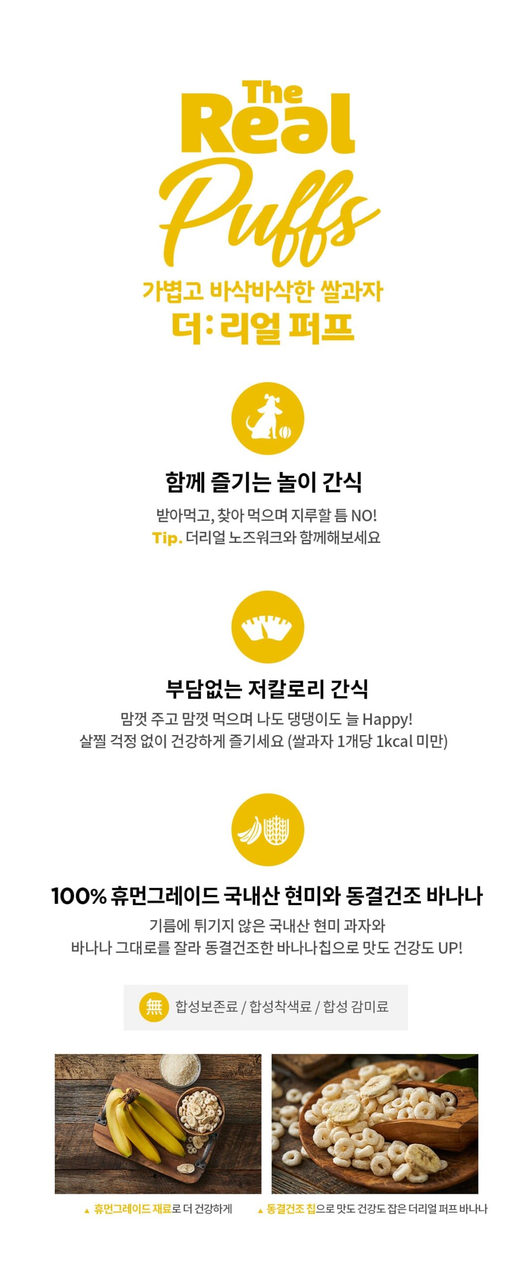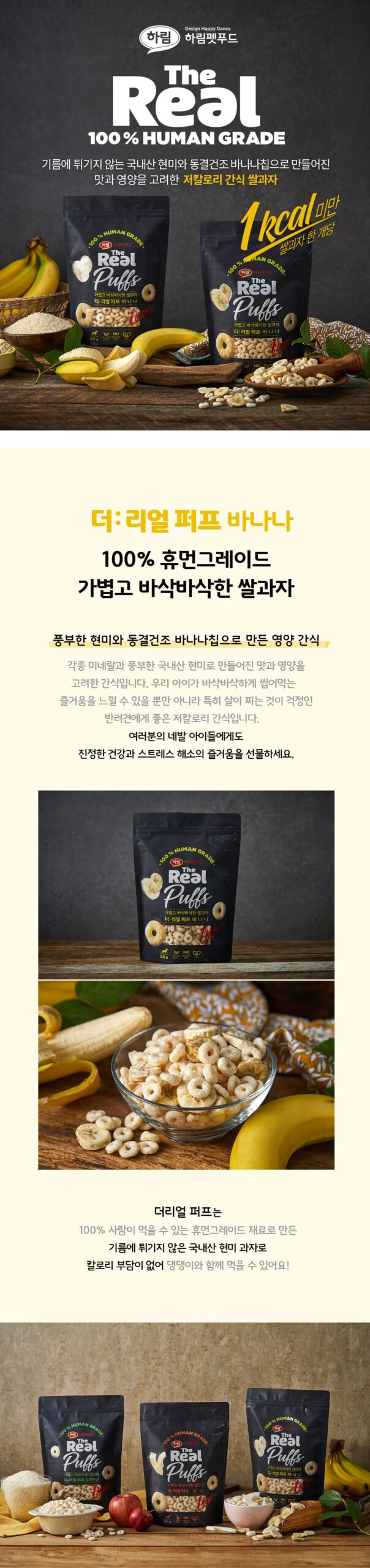 HARIM The Real Puffs Banana is made from domestic brown rice snacks that are not fried and are paired with freeze-dried banana chips. This combination enhances both the flavor and the health benefits of the snack.