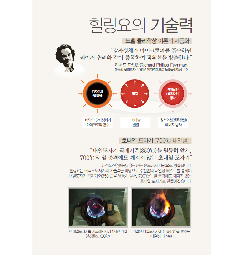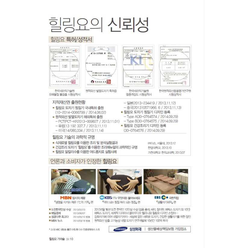 HEALINGYO features patented far-infrared heating ceramics, recognized in Korea, Japan, and China. Made of heat-resistant ceramics that withstand temperatures up to 500ºC, exceeding the international standard of 280ºC.