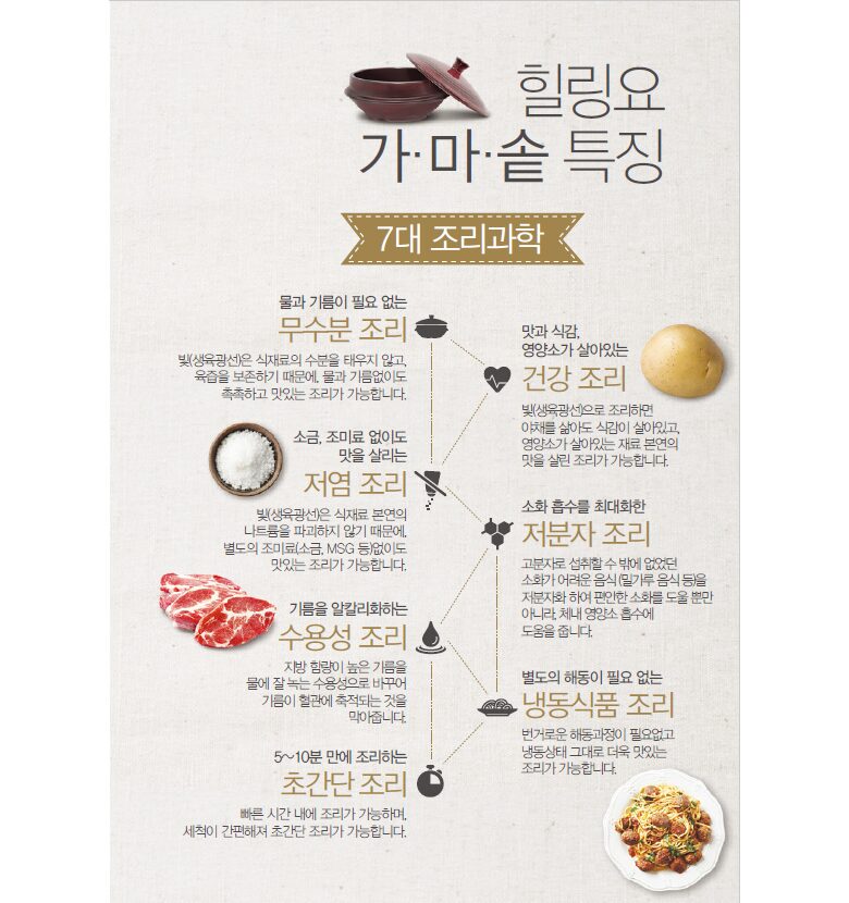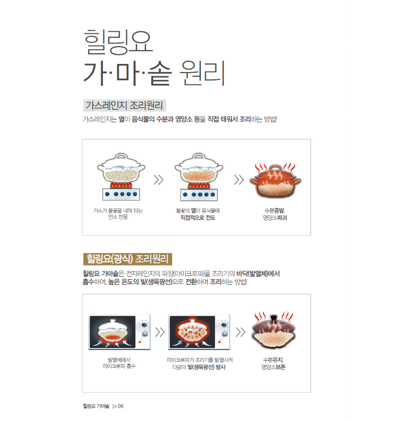 HEALINGYO utilizes light (far-infrared) cooking. A ferromagnetic heating element absorbs microwaves, generating magnetic resonance and converting it into far-infrared energy to cook food.
