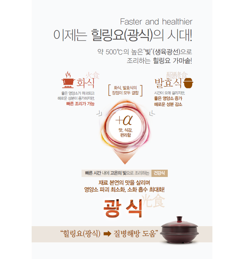 HEALINGYO utilizes light (far-infrared) cooking. A ferromagnetic heating element absorbs microwaves, generating magnetic resonance and converting it into far-infrared energy to cook food.
