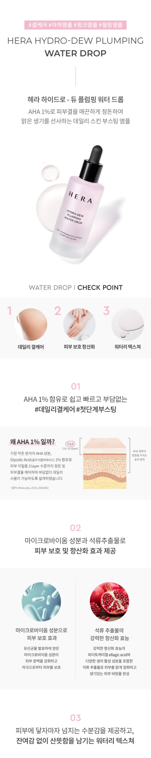 最近、HERA Hydro Dew Plumping Water Dropを試しました。1%%のAHAが配合されているため、このアンプルはとても軽やかでありながら肌に効果的な exfoliation を提供します。その質感もクリーミーですが、不快感なく浸透していく感じがあります。特に重宝するのが Resuscitation Plant Extract。この成分は真夏の日差しでも肌を元気づけてくれました。そして5-Hyal Mixerによる潤い持続力!他では味わえない深層からうるおった瞬間、日常のお手入れへの愛着も高まります。