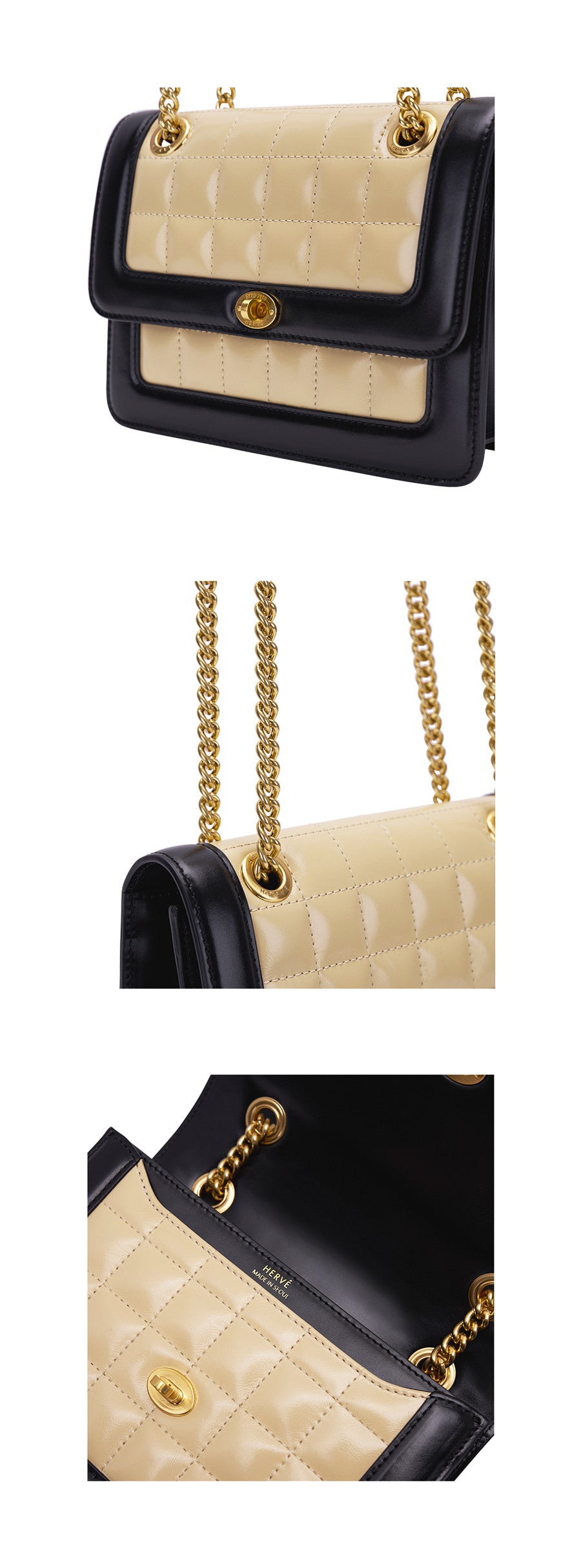 Delight in the intricate craftsmanship of the HERVÉ Damier Flap Bag, showcasing an elegant quilted damier (lattice) pattern. Adorned with the distinctive Hervé logo, the turnlock and eyelets are meticulously engraved, enhancing the bag’s allure. The chain, plated in a sophisticated matte gold, adds a touch of opulence while maintaining a lightweight feel, perfecting the bag’s overall aesthetic.