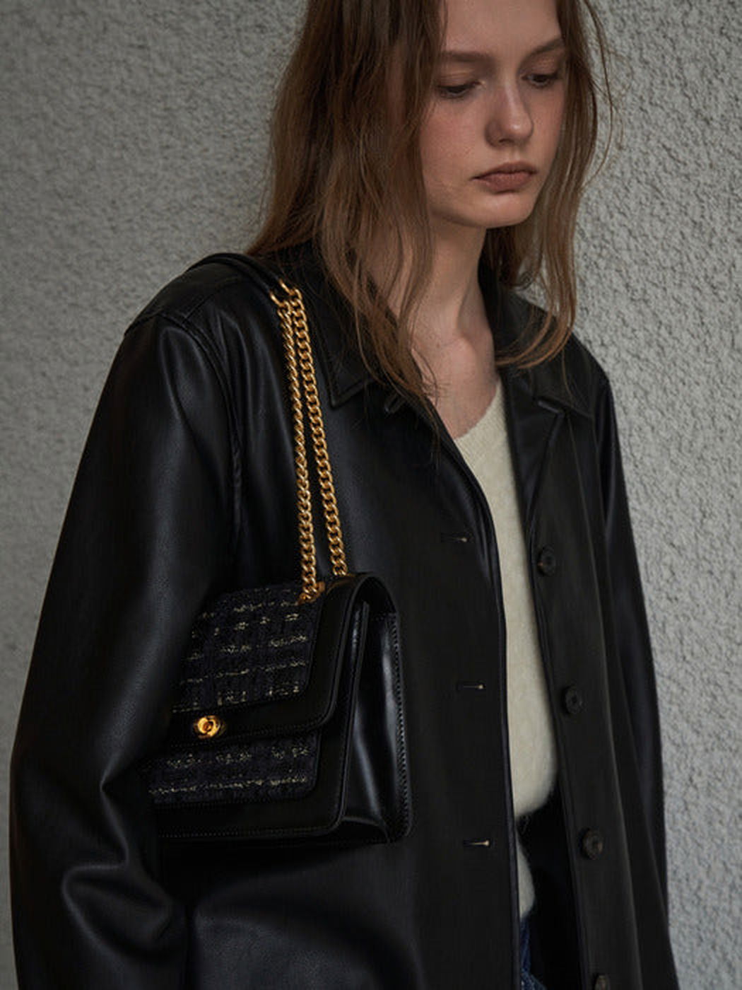 This bag is a testament to high-fashion creativity, blending various textures and materials for a unique, three-dimensional design. It features a harmonious mix of voluminous smooth leather, intricately crinkled leather, premium Italian suede, and exquisite tweed fabric from Japan’s renowned ‘STYLE M’ company. Each material is carefully chosen for its luxurious texture and quality, contributing to the bag’s distinguished appearance.
