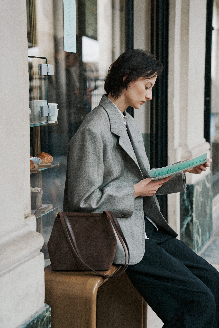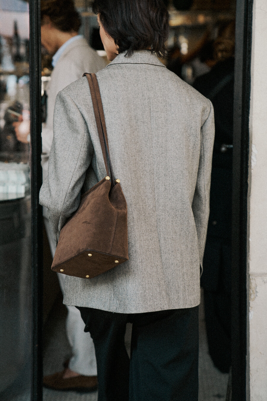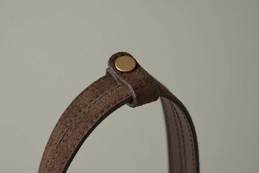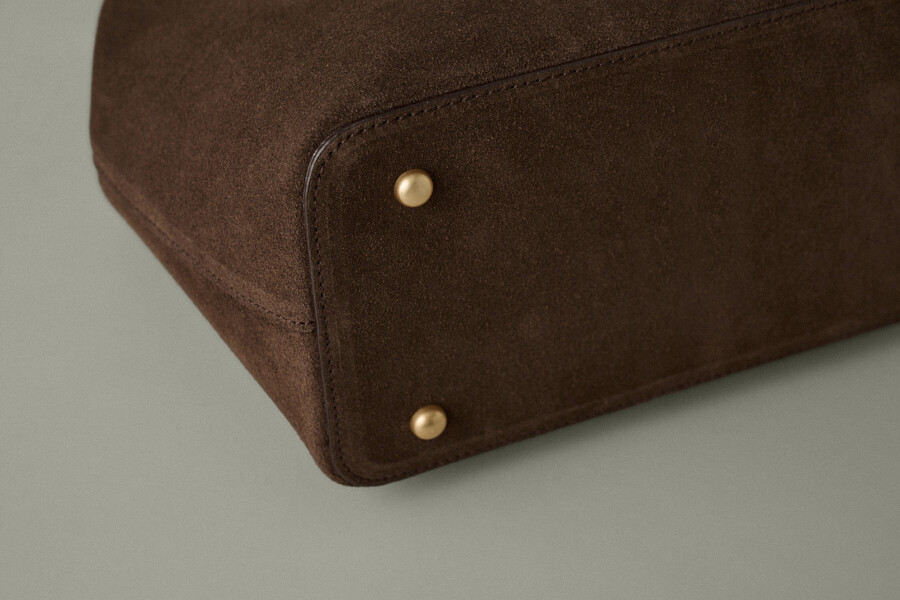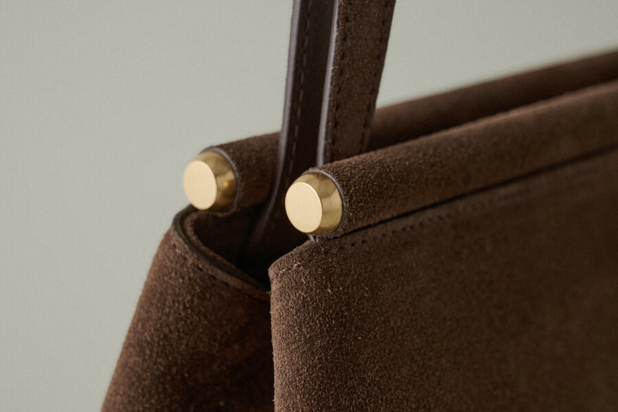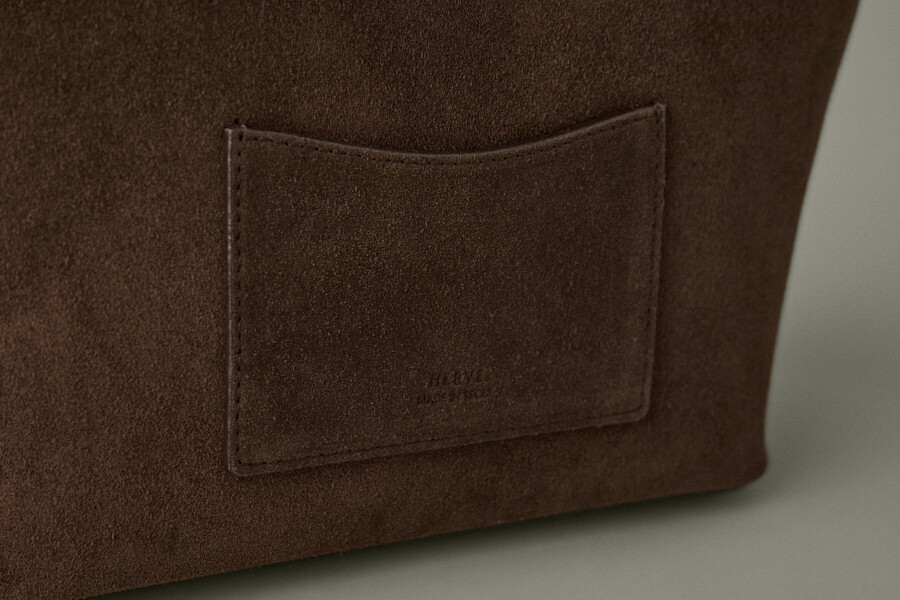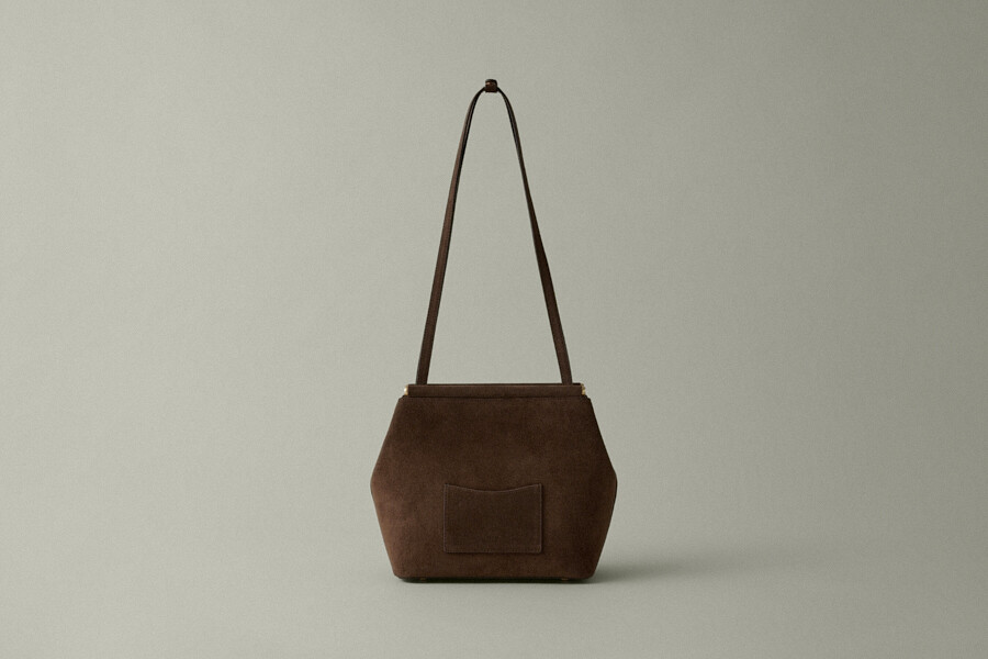 The HERVE KATE BAG is a beautifully crafted shoulder bag made with luxurious Italian suede in a rich brown color. This elegant design from Korean brand HERVE combines timeless sophistication with everyday practicality.